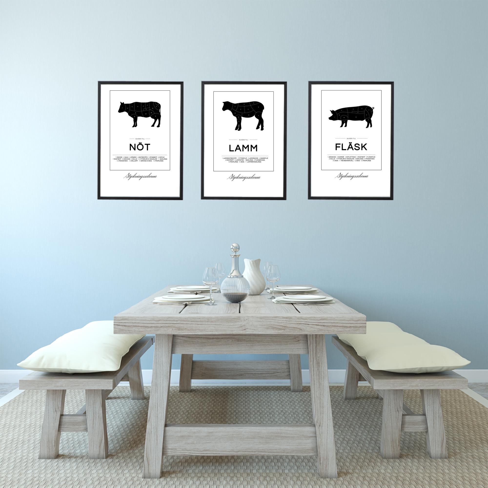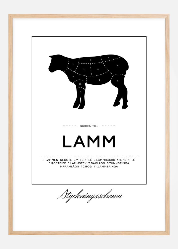 Naučite se, kje najti vse dobrote iz jagnjeta s to privlačno poster sliko na steni. Poster prikazuje črno jagnje, ki je razdeljeno na oznake, ki kažejo, kje se na primer vzamejo zunanji file, jagnječja rebra in pleče. Kot dopolnilo sliki je napisan tekst "Vodič po jagnjetu" skupaj z urejenim seznamom številk za različne dele. Okrog besedila in slike teče tanka pravokotna črta, pod pravokotnikom pa je natisnjen napis "Shema rezanja".