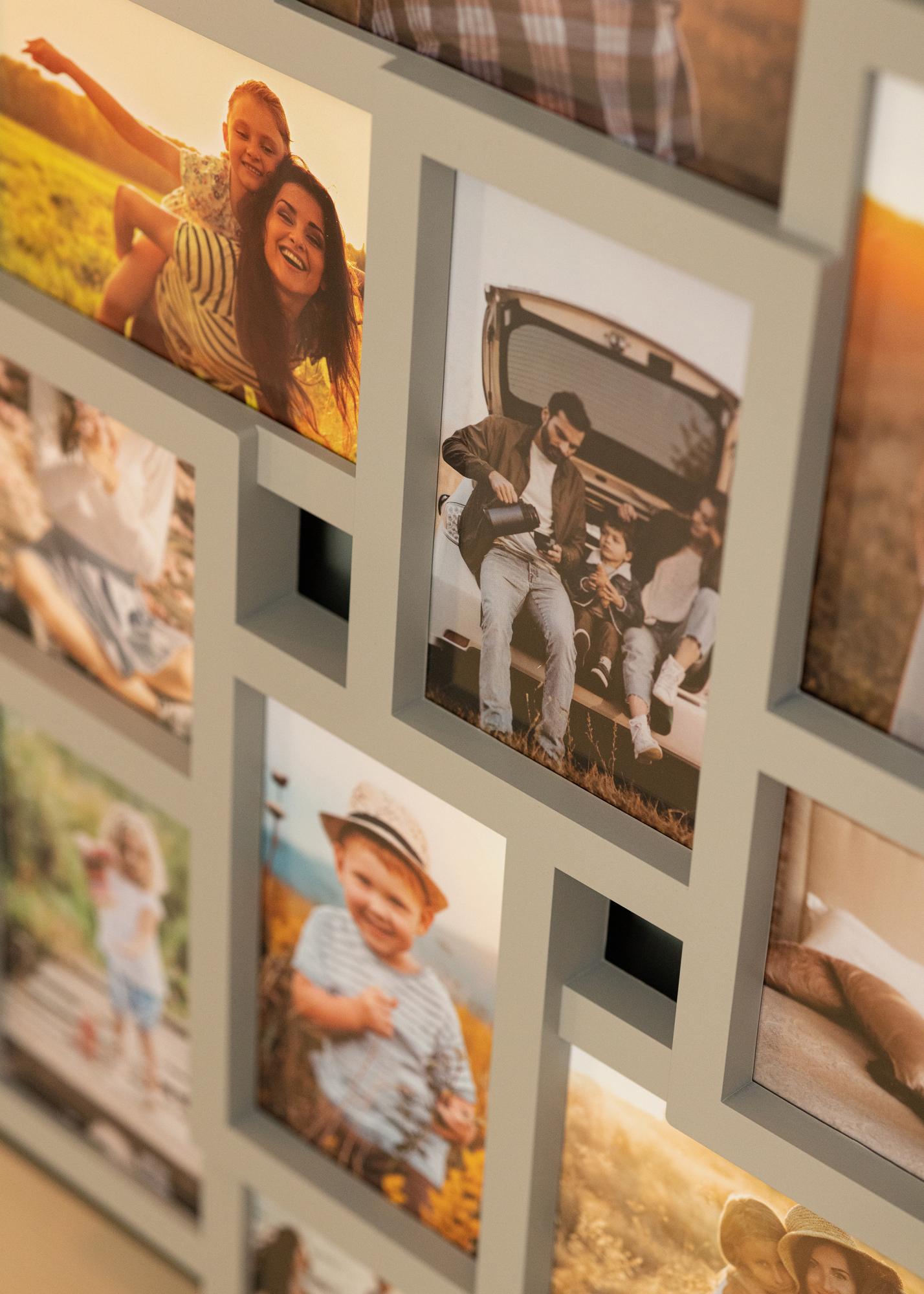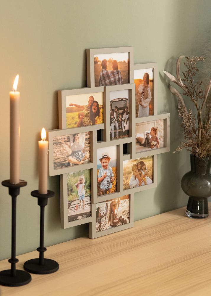 To je kolažni okvir s prostorom za 10 slik v velikosti 10x15 cm. Okvir združuje fotografije v pokončnem in ležečem formatu, kar ustvarja zelo dinamičen izraz. Sofisticirana siva barva bo poudarila barvne odtenke vaših slik in pustila, da motivi pridejo v ospredje. Vaše motive vstavite v okvir tako, da odstranite zadnji del, ki ga držijo na mestu majhne vrtljive sponke. Vse fotografije so pritrjene z enim samim zadnjim delom, tako da lahko preprosto vstavite vse slike v okvir hkrati.
