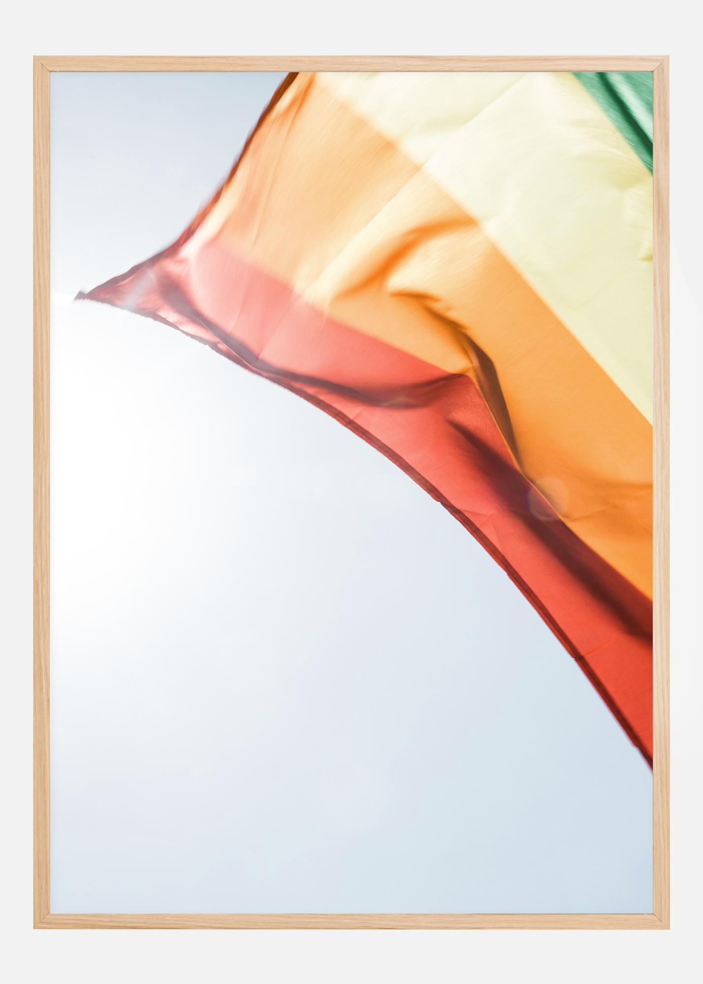 Simbolni tisk zastave na sivi podlagi. Nameščena v zgornji polovici tiska, zastava rahlo vihti v vetru. Rdeče, oranžne, rumene in zelene črte so razporejene vodoravno na zastavi. Barvit plakat, ki poživi katero koli prazno steno.