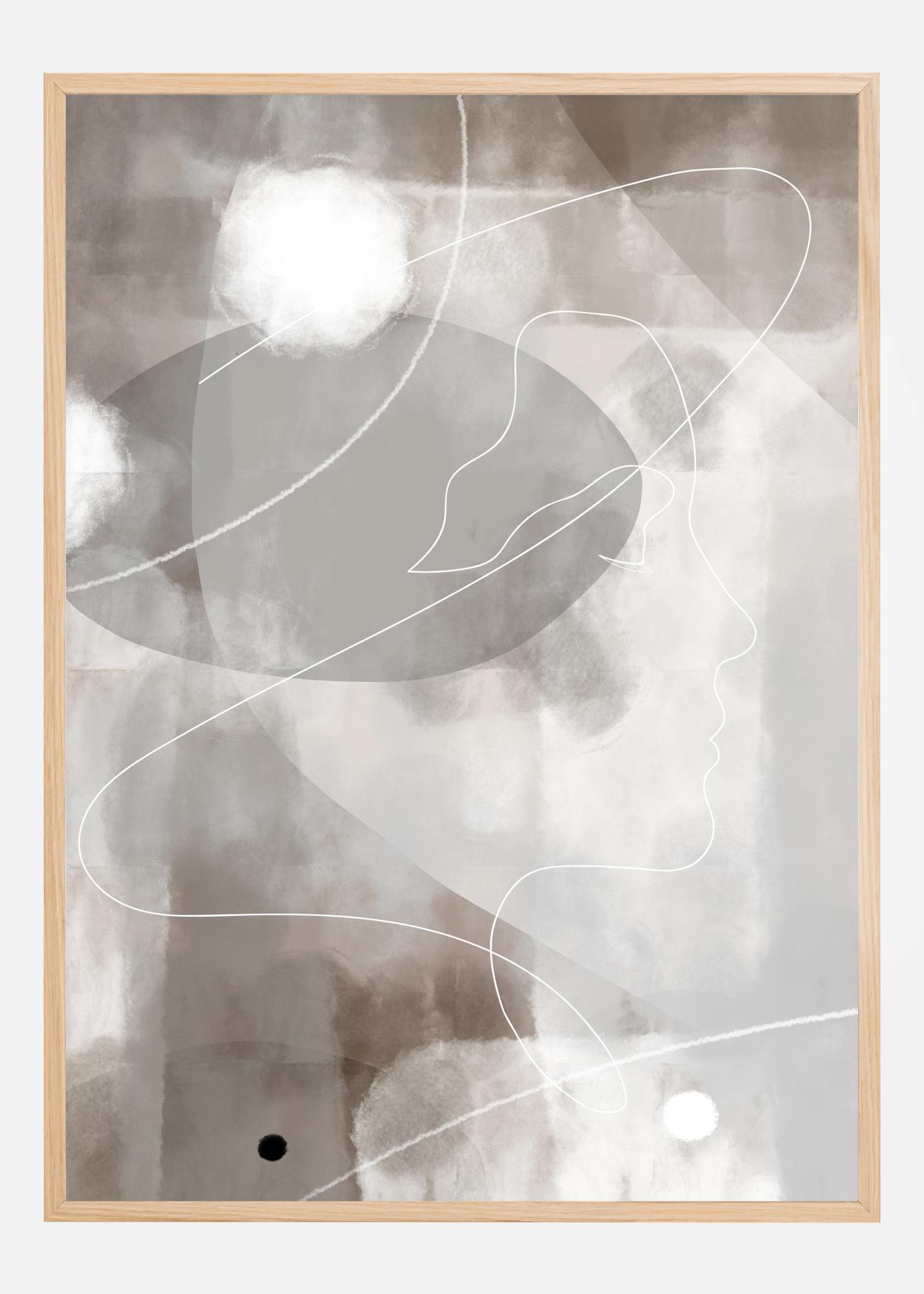 Umetniško delo, ki prikazuje žensko z klobukom. Ta čudovit profilni tisk je spretno narisan, ne da bi kadarkoli dvignili čopič s tiska. Silhueta ženske je postavljena na svetlo rjavo ozadje z nekaj belimi oblaki v zgornjem delu tiska. Čudovit plakat za žensko spalnico.