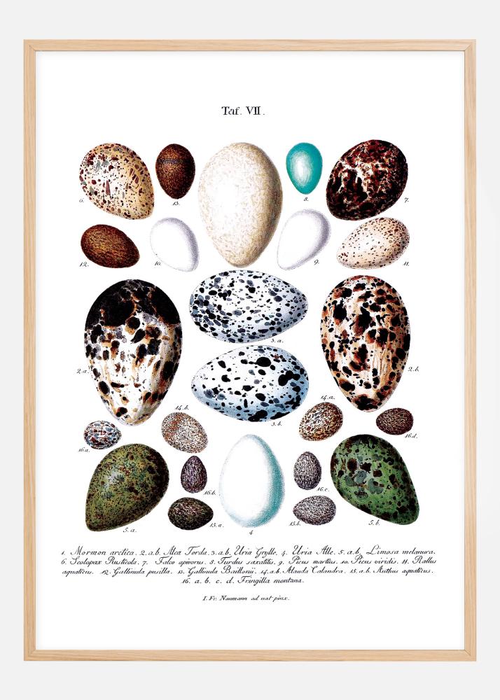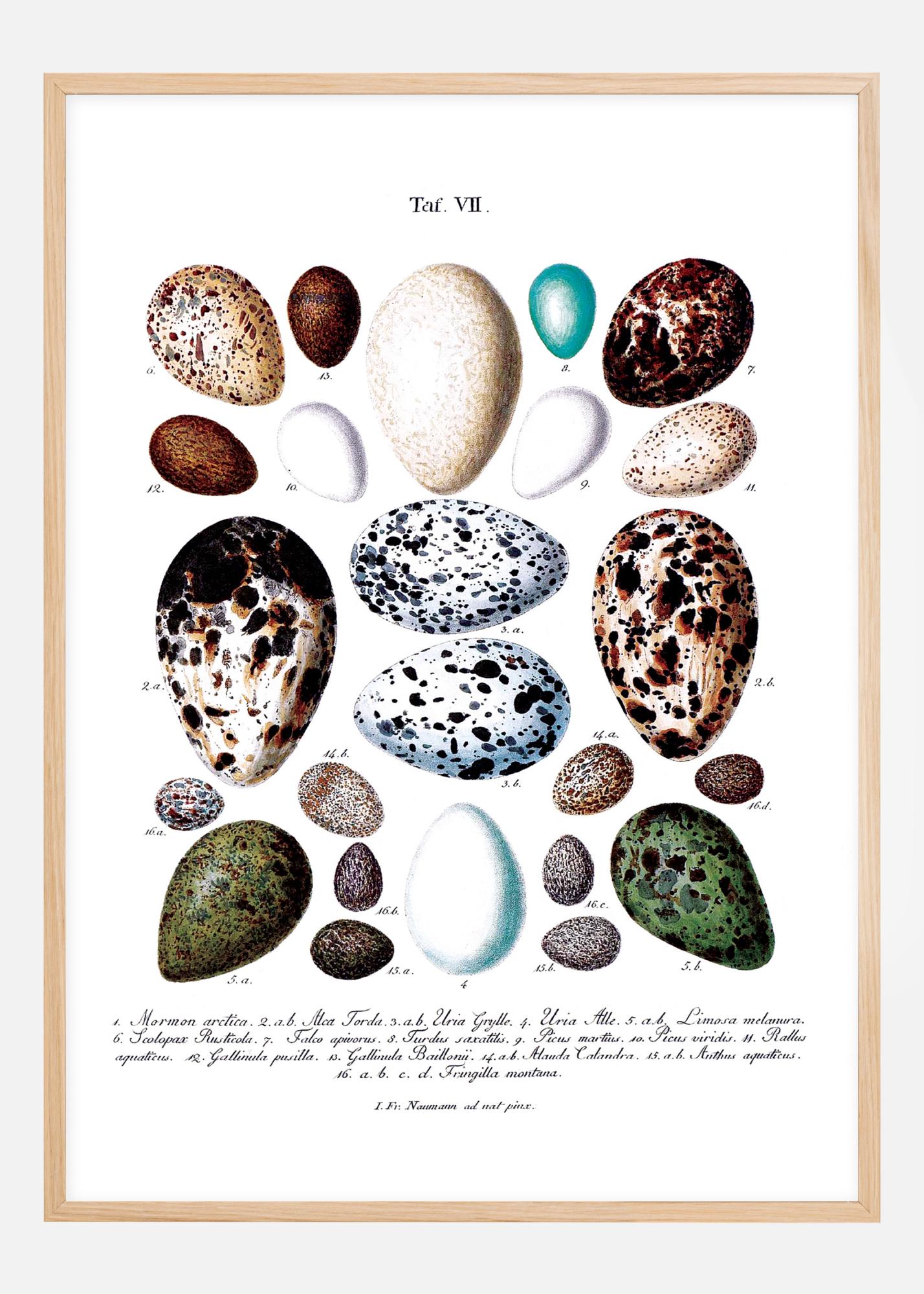 Vam je všeč barva in oblika? Potem ste morda pomislili, da je narava najboljša oblikovalka! Ta plakat je kopija stare šolske table, ki prikazuje različna ptičja jajca. Pod pisanimi jajci najdete številke, ki se nanašajo na latinski opisni tekst na dnu. Besedilo vas obvešča, kateri ptičji vrsti pripada posamezno jajce. Zelo lep plakat za tiste, ki radi kombinirate vintage z naravnimi barvami! Ker je plakat na voljo v več različnih velikostih, boste zlahka našli tistega, ki vam ustreza.