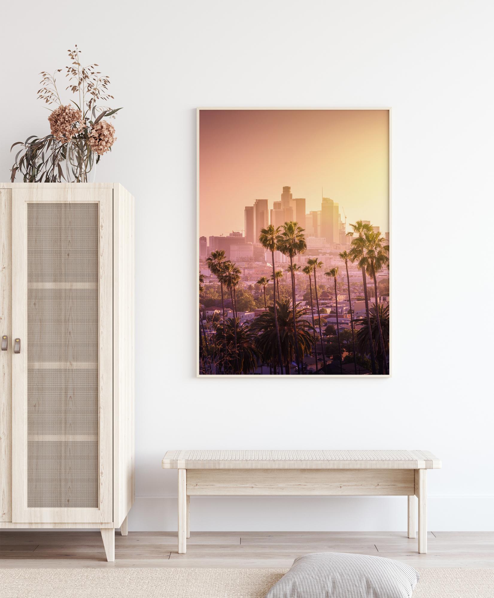 Tisk mesta, posnetega na daljavo. V ospredju sliko dominirajo visoke palme, medtem ko nebotičniki v daljavi gledajo navzdol na mesto. Oranžno in vijolično obarvano nebo se odseva na mestnih zgradbah in jim daje vijoličen videz. Popoln plakat za vse, ki obožujejo arhitekturo.