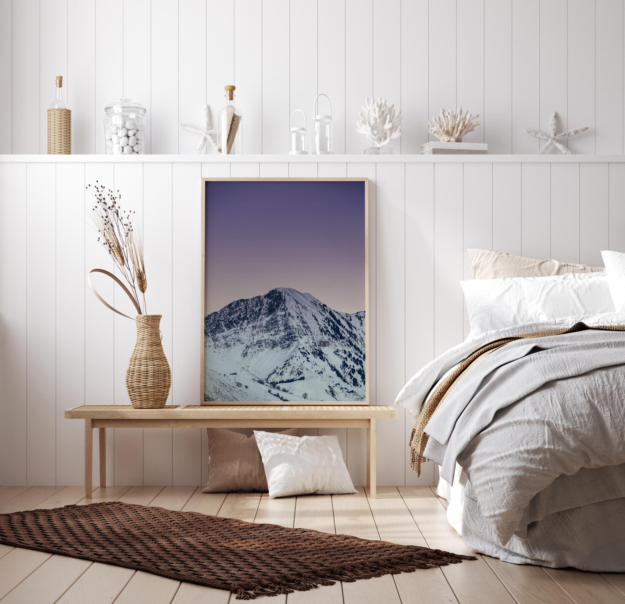 Zvezdnata noč nad masivno belo goro. Ta impresivna, snežno pokrita gora je postavljena pod čudovito vijolično nebo. Vijolično nebo se odbija od vrhov gora in ustvarja topel občutek v tisku. Čudovita slika za obešanje v hladnem okolju.
