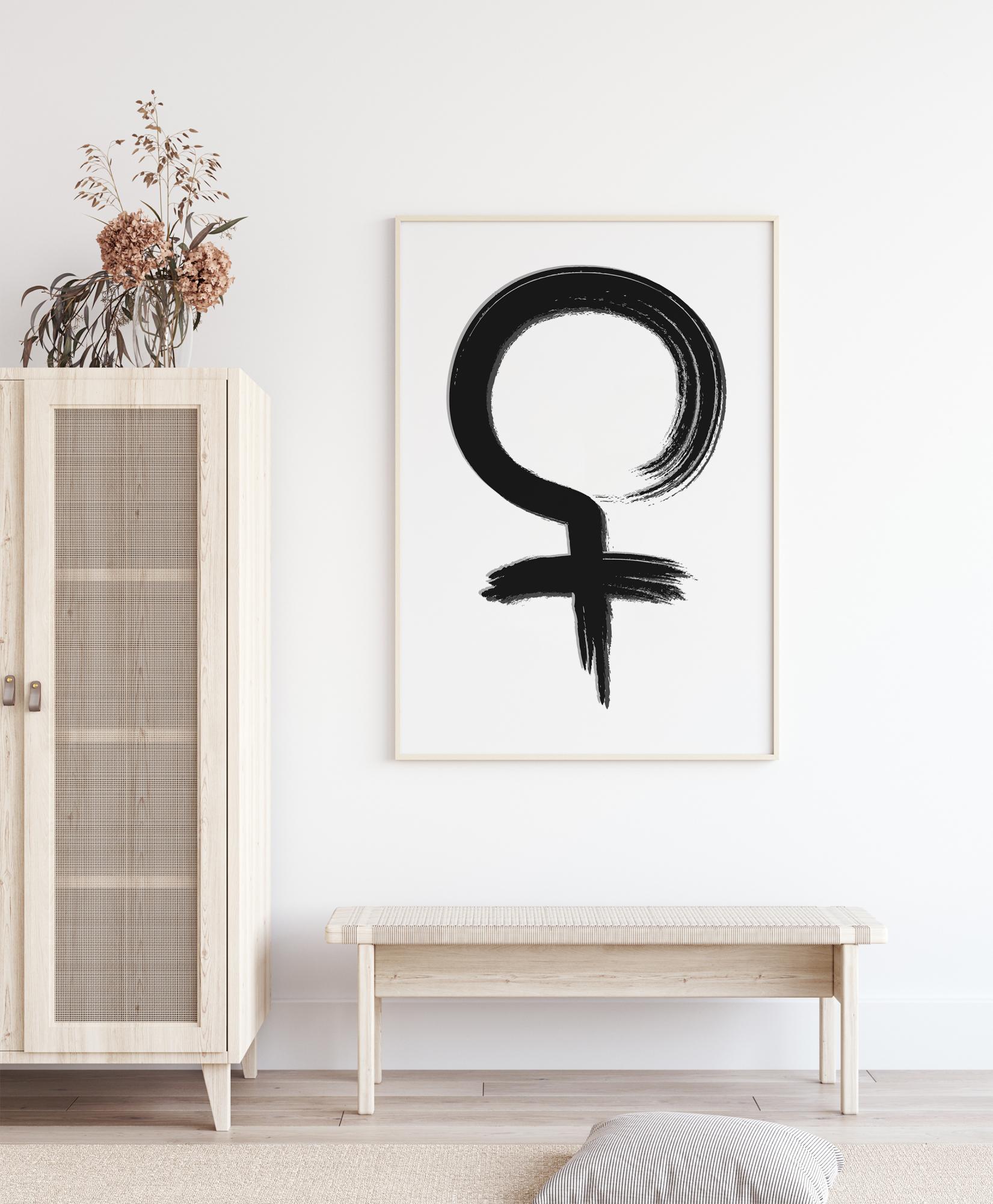 Preprost črno-beli tisk, ki prikazuje znak za žensko z nepopolnim krogom. Na belem ozadju črni simbol zbledi proti koncu kroga. Popoln plakat za obešanje v ženskem okolju.