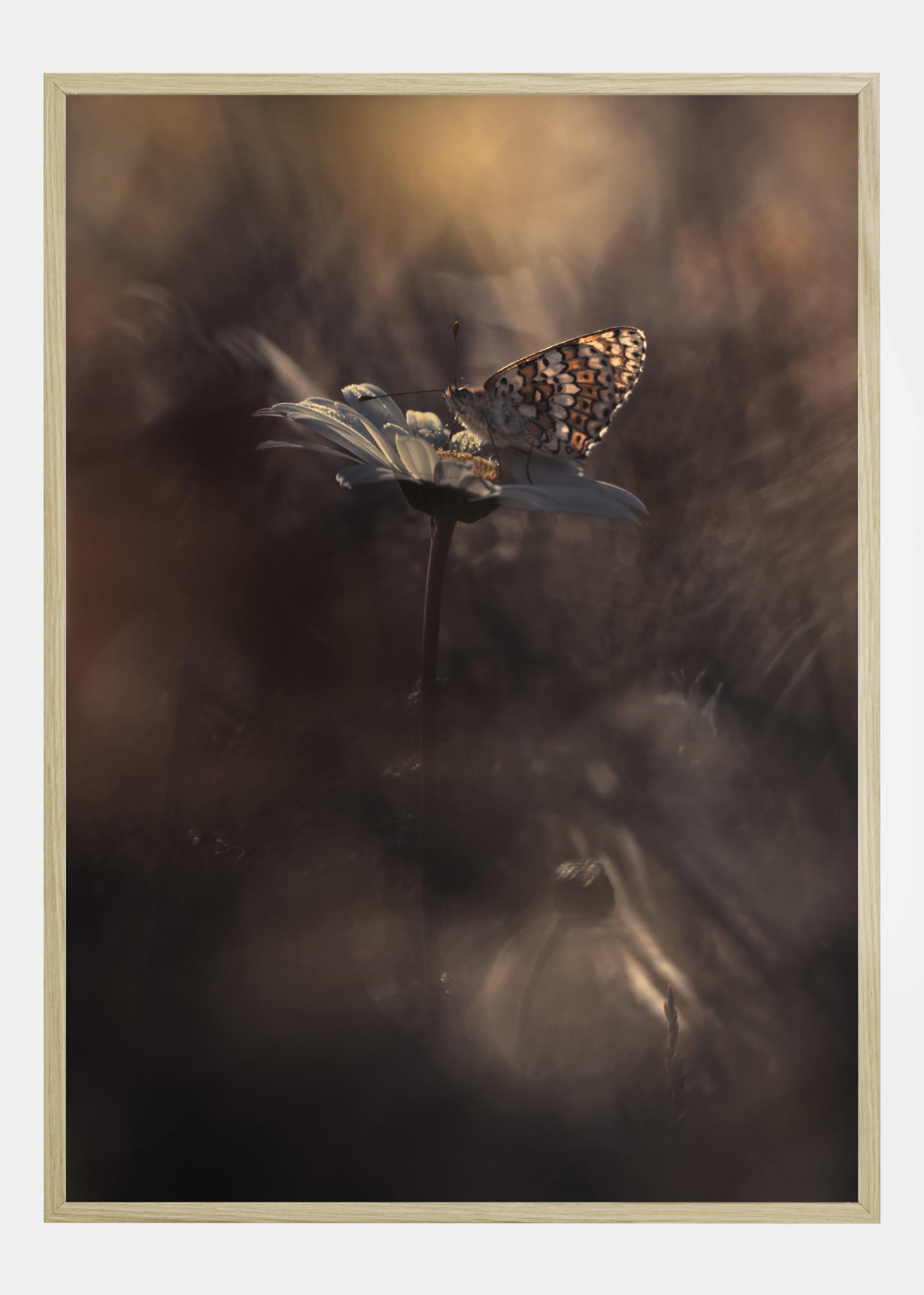 Popoln posnetek od blizu oranžnega metulja, ki sedi na preprostem steblu marjetice. Na mehkem pastelno obarvanem ozadju zamegljene barve poudarjajo čudovit in krhek cvet ter metulja. Osupljivo lep plakat za obešanje nad kaminom.
