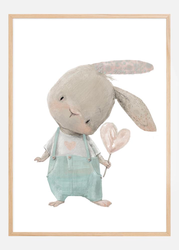 Ta čudovit plakat prikazuje majhnega zajčka, ki drži srčkasto balon, upodobljen s finostjo in občutkom skozi akvarelno slikanje. Zajčkov nežen, sanjav pogled in fina detajlna obdelava njegovih oblačil, ki vključujejo pastelno obarvane cvetlične vzorce, daje občutek nedolžnosti in čistosti. Ta ilustracija je očarljiva poklon ljubezni in skrbi, ki jo vzbuja srčkast balon.