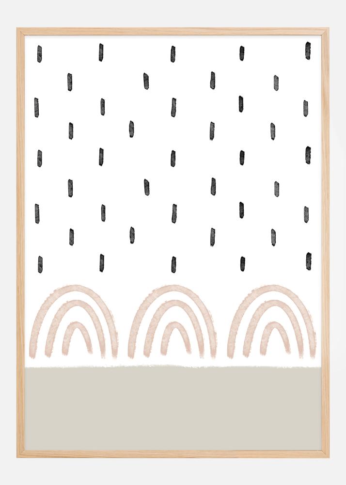 Ta umetniški plakat, "Rain on Rainbows", združuje igrivost in minimalizem na edinstven način. Motiv predstavlja ozadje z akvarelnimi mavricami v blagih odtenkih terakote na čisti beli podlagi. Preko teh mehkih lokov je vidna zbirka abstraktnih potez čopiča, ki spominjajo na dež, lebdeče v neurejeni simetriji. Barve v mavricah se čudovito kontrastirajo s črnilno črnimi "kapljicami dežja", kar ustvarja dinamično, a še vedno harmonično sliko.