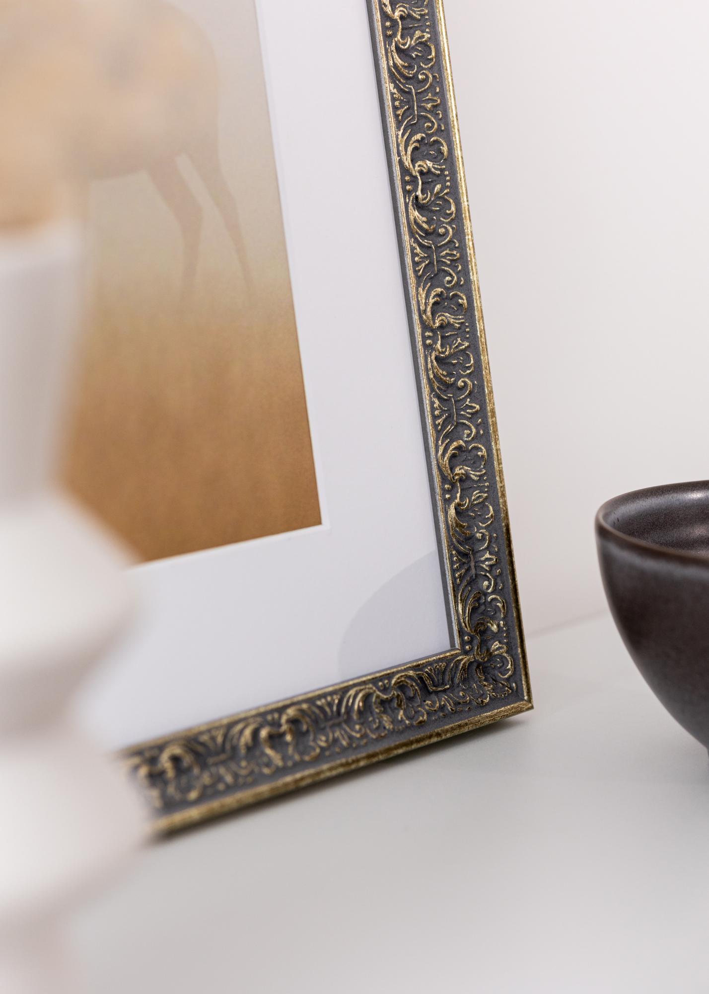 Ta eleganten okvir za fotografije je popolna kombinacija klasičnega dizajna in moderne funkcionalnosti. S svojim starinskim slogom in čudovito podrobno okrasno izrezljano v sivkastem odtenku z zlatimi poudarki, daje občutek vintage sloga, ki izboljša katerokoli sobo. Okvir je izdelan iz lesa in ima 25 mm široko letvico ter globino 24 mm, kar mu daje robusten in trden občutek.