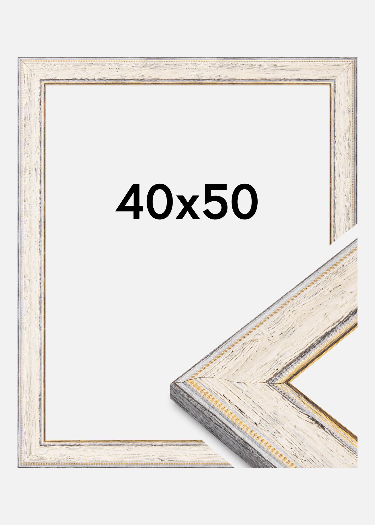 Ta elegantna foto okvir je popolna kombinacija vintage navdiha in moderne funkcionalnosti. Z velikostjo 40x50 cm je idealen za poudarjanje vaših najljubših fotografij ali umetniških del. Okvir je izdelan iz lesa in ima čudovito, rustikalno belo in sivo končno obdelavo, ki ji daje šarmantno postarano podobo. Subtilne zlate podrobnosti vzdolž notranjega roba dodajo klasičen pridih, ki se odlično poda tako k podeželskim kot shabby chic notranjostim.