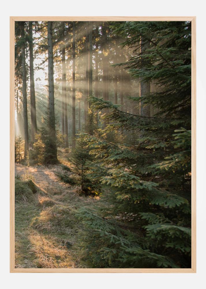 Očarljiv portret gozda. Medtem ko sončni zahod sveti skozi liste, je tla obdana z manjšimi drevesi. Ta slikovita pokrajina ustvarja prijetno toplo vzdušje ter sproščujoče in osvežujoče okolje. Popoln plakat za zeleno dnevno sobo.