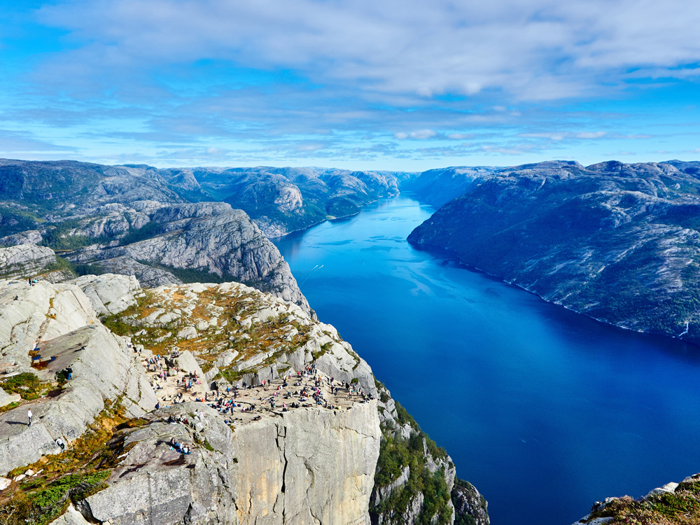 Fotografija z neskončnim dih jemajočim razgledom čez globoko fjordsko dolino. Poster je v morsko modrih tonih s soncem osvetljenimi golimi pečinami na obeh straneh fjorda, veličastna pokrajina, ki se prilega na steno tistega, ki ceni lep prizor narave. Dopolnite sliko z okvirjem, ki poudarja motiv.