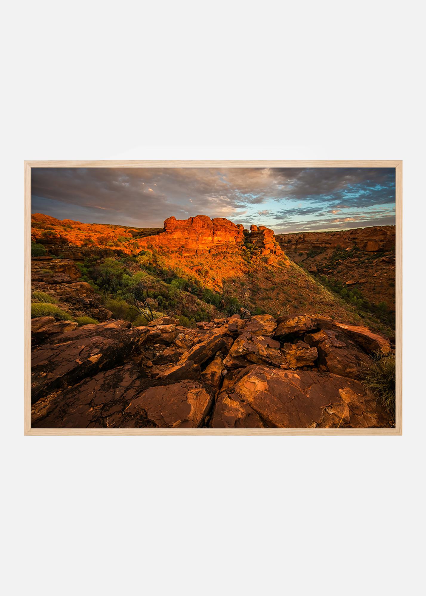 Plakat s fotografijo surovih rdečih gora ob sončnem zahodu, nekaj za tiste, ki imajo radi puščave in skalne formacije za obešanje na steno. Topli rdeči odtenki proti ledeno modremu nebu in globina v sliki ustvarjajo zanimiv motiv. Uokvirite poster z elegantnim foto okvirjem in ga postavite na steno skupaj z drugimi puščavskimi motivi.