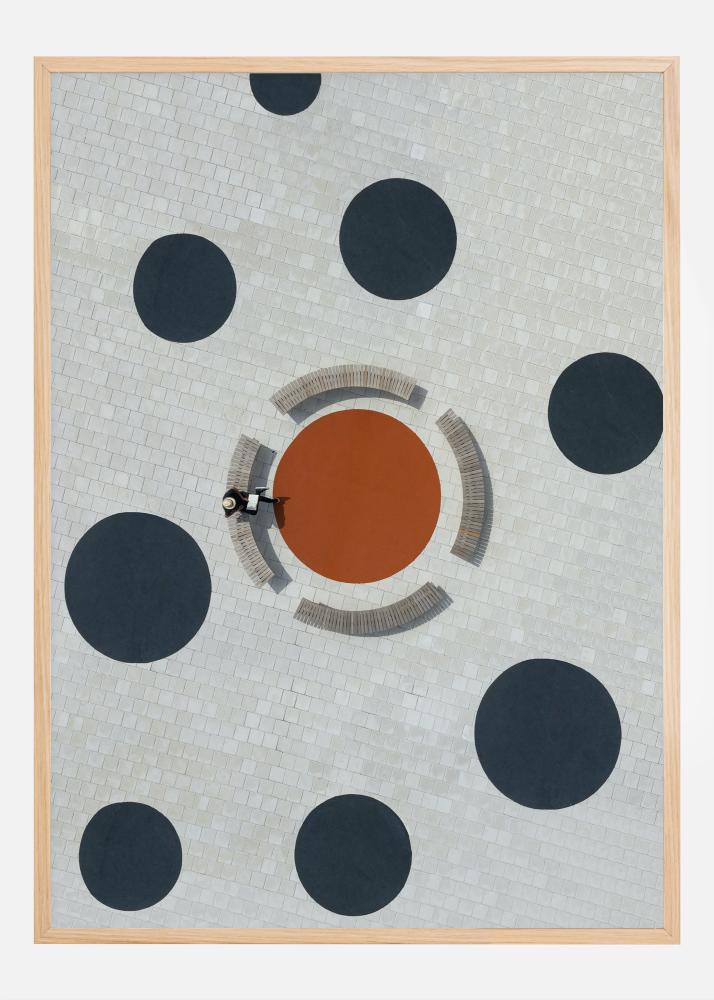 Ta konceptualni plakat ujame edinstven, ptičji pogled na osebo, ki bere, obdano s simetrično in grafično kompozicijo. Abstraktna zasnova bele ploščice površine, preluknjana z velikimi črnimi krogi in osrednjim, rjasto rdečim krogom s klopmi, zagotavlja močan vizualni kontrast. Ta plakat ni le poklon oblikovanju in arhitekturi, temveč tudi igriva interpretacija vsakdanjih prizorov.