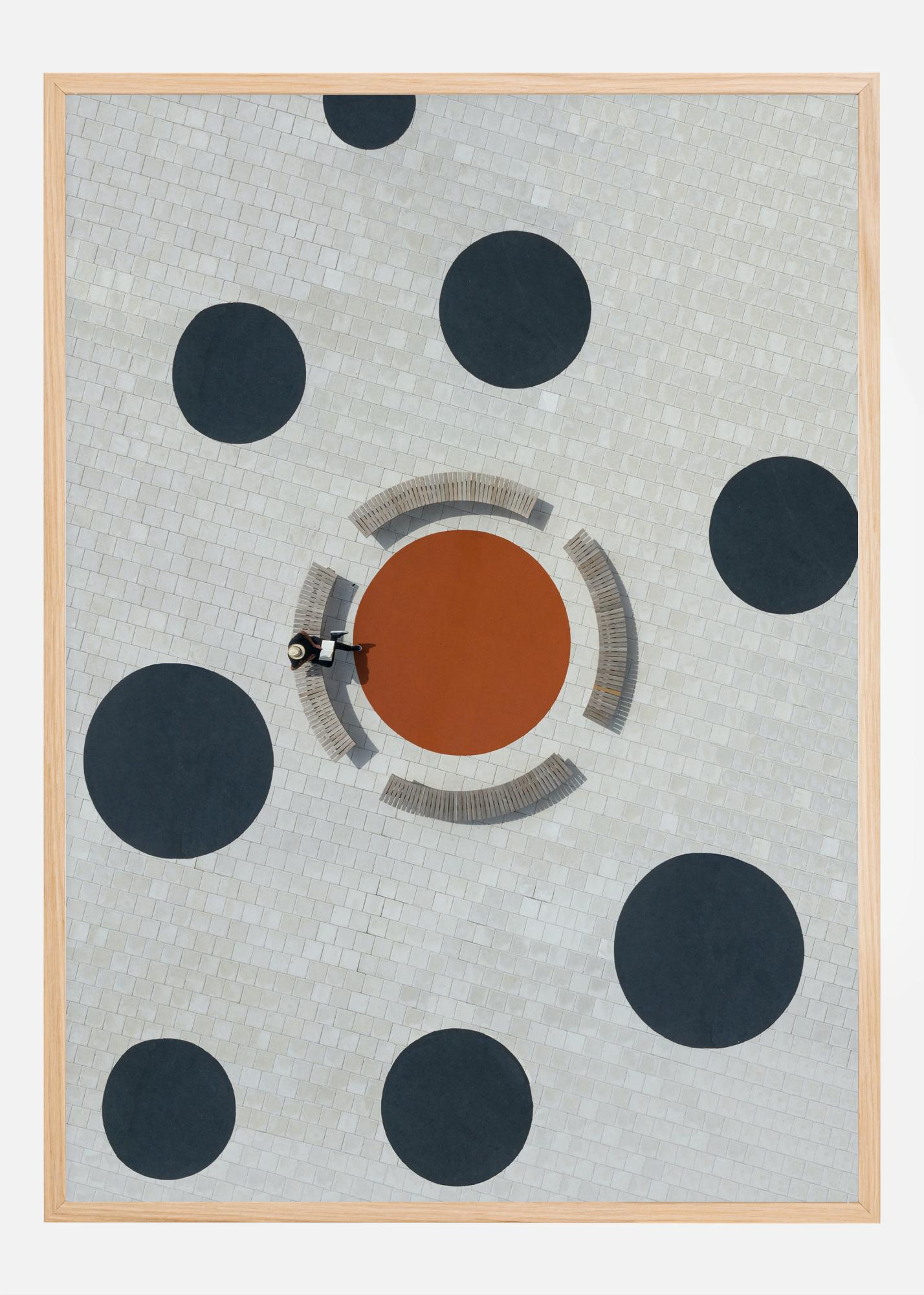 S svojimi čistimi linijami in drzno barvno paleto - čisto belo ozadje, drzni črni detajli in edinstven rjasto rdeč krog - ta tisk ponuja moderno in elegantno estetiko. Idealna je za pisarniške prostore, knjižnice ali katerikoli minimalističen dom, ki želi dodati sodoben pridih. Ta prizor, posnet od zgoraj, je popoln za tiste, ki cenijo edinstvene perspektive in vlogo oblikovanja pri ustvarjanju lepote v vsakdanjem življenju.