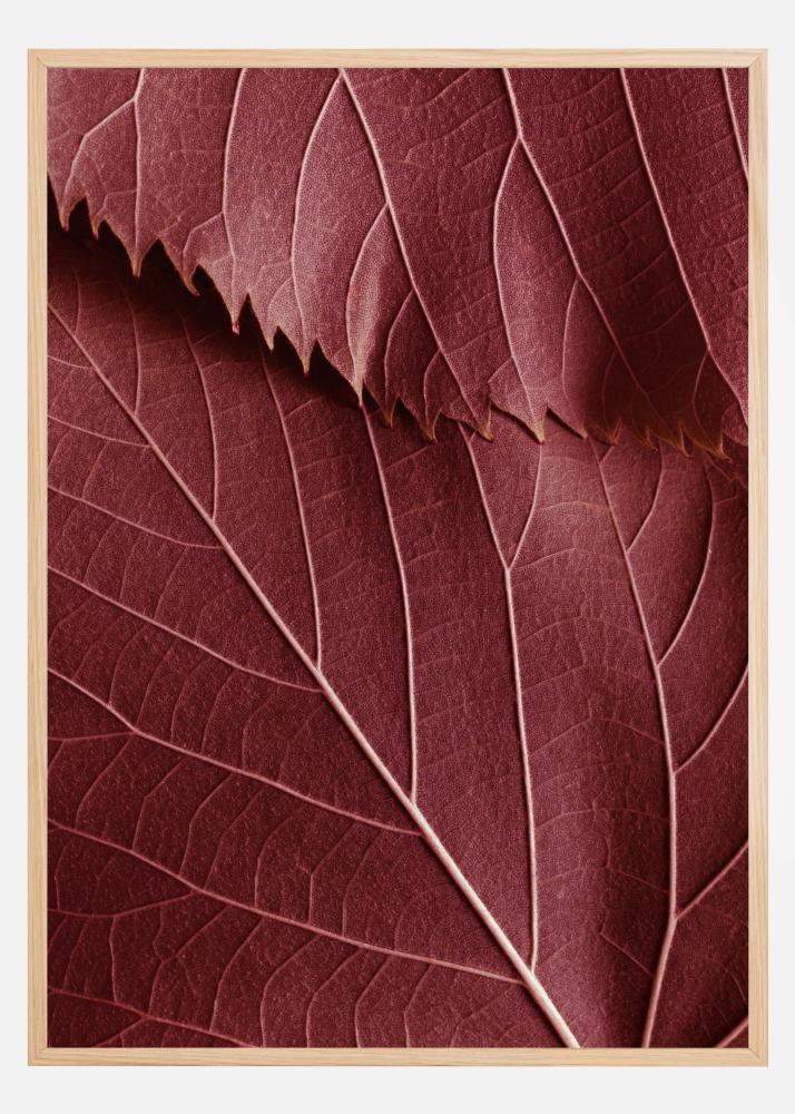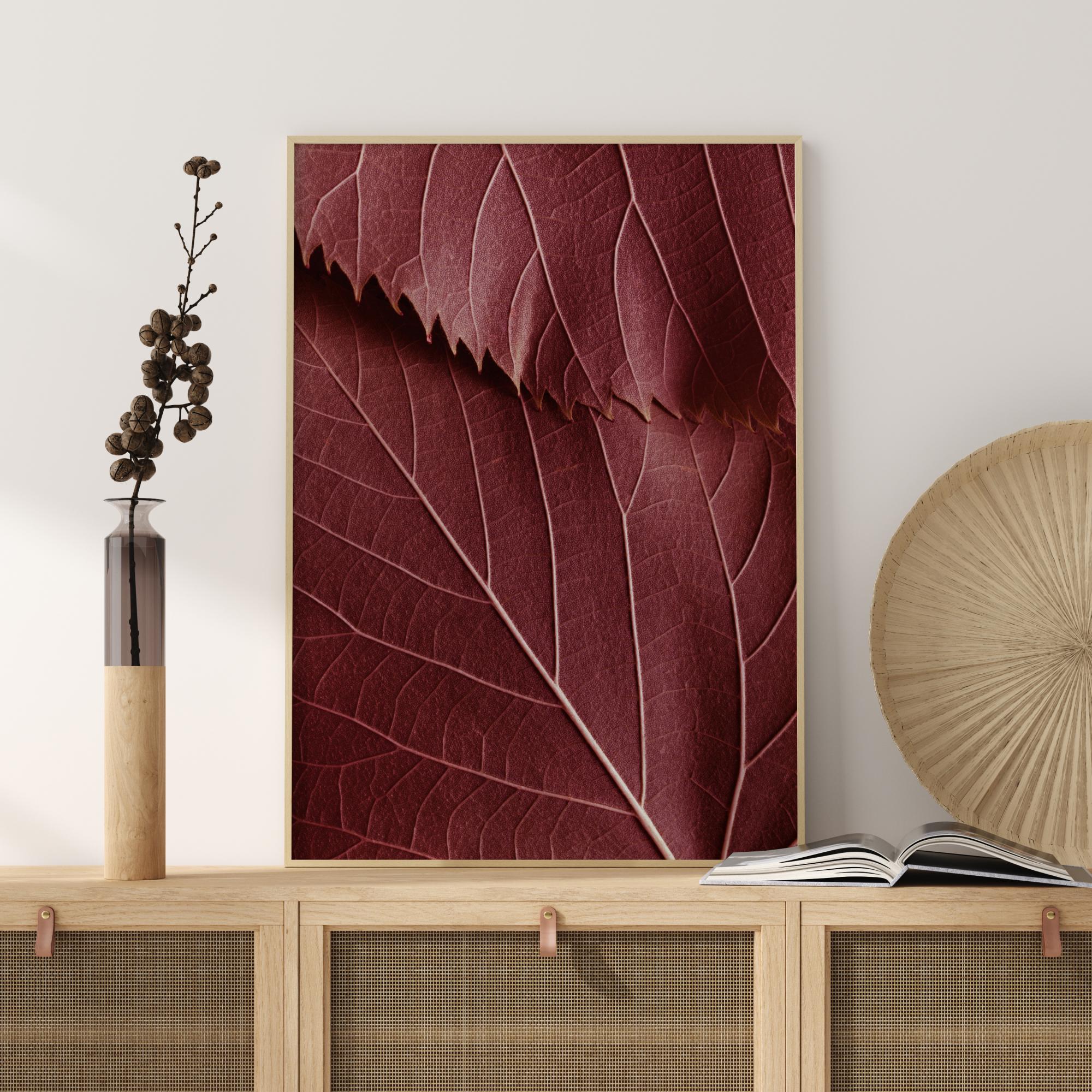 Botanična fotoumetnost temno rdečih listov z živahnimi vzorci. Elegantna poster v toplih odtenkih v stilu, ki jo naredi popolno za kombiniranje z drugimi čudovitimi motivi na večji stenski galeriji.