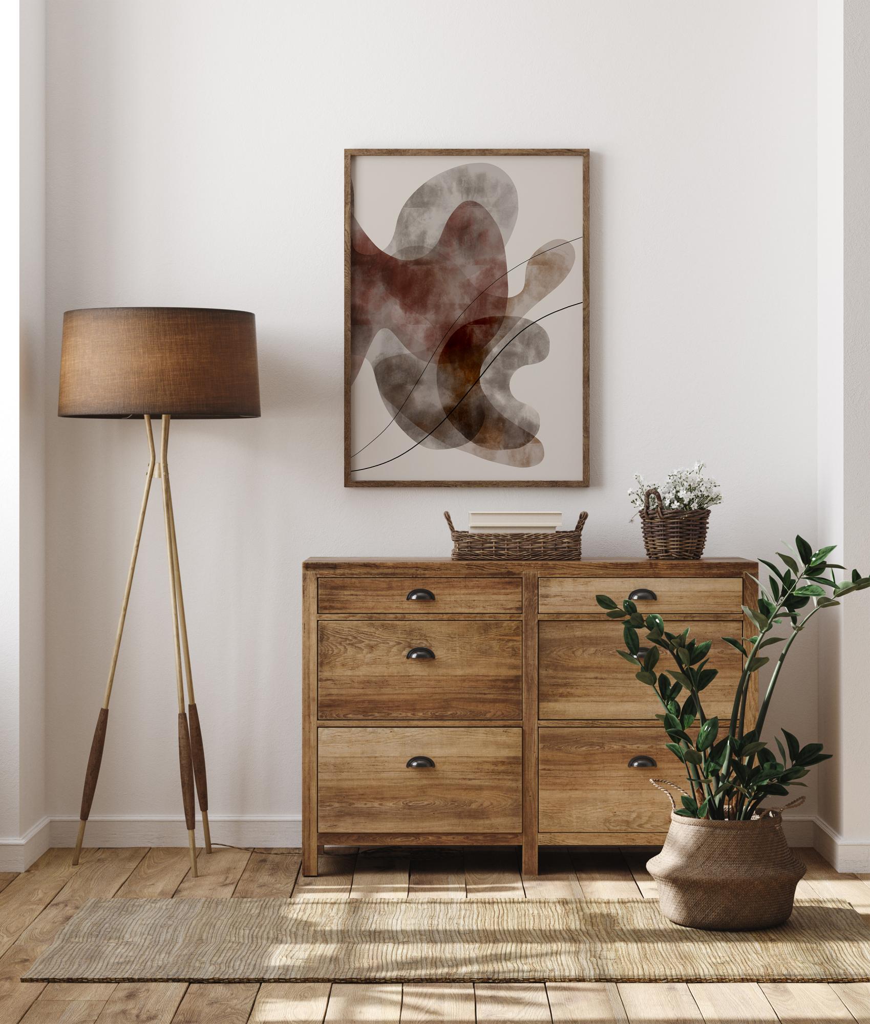 Abstrakten plakat s čudnimi oblikami v različnih barvah, ki spominjajo na morsko travo. Oblike so napolnjene z mehkimi rjavimi, sivimi, roza in zelenimi barvami z meglenim tonom. Dve liniji se dramatično vrtinčita čez osrednje oblike, ki so postavljene na beli osnovi. Združite z ozadjem v mehkih pastelnih barvah za zanimiv pogovor.