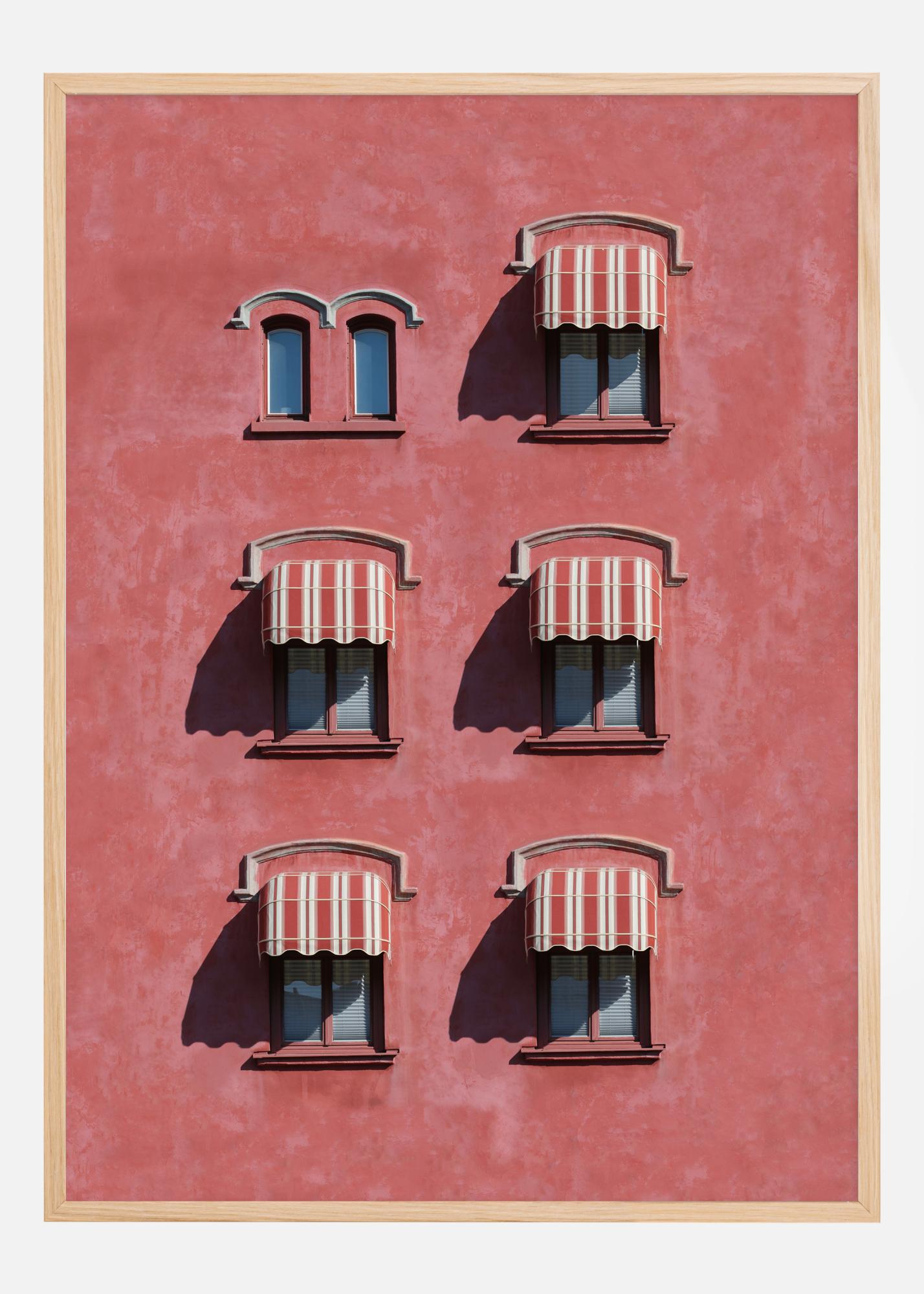 Ta elegantna in prefinjena plakat "Rdeča stena" je prikaz arhitekturne harmonije in vizualnega ravnotežja. Šest oken, vsako z značilno tendo, krasi živahno rdečo fasado in ustvarja ritmično simetrijo, ki je hkrati pomirjujoča in zadovoljiva za oko. Igriva sončna svetloba na površini oživlja strukturo in ustvarja igro med svetlobo in senco.