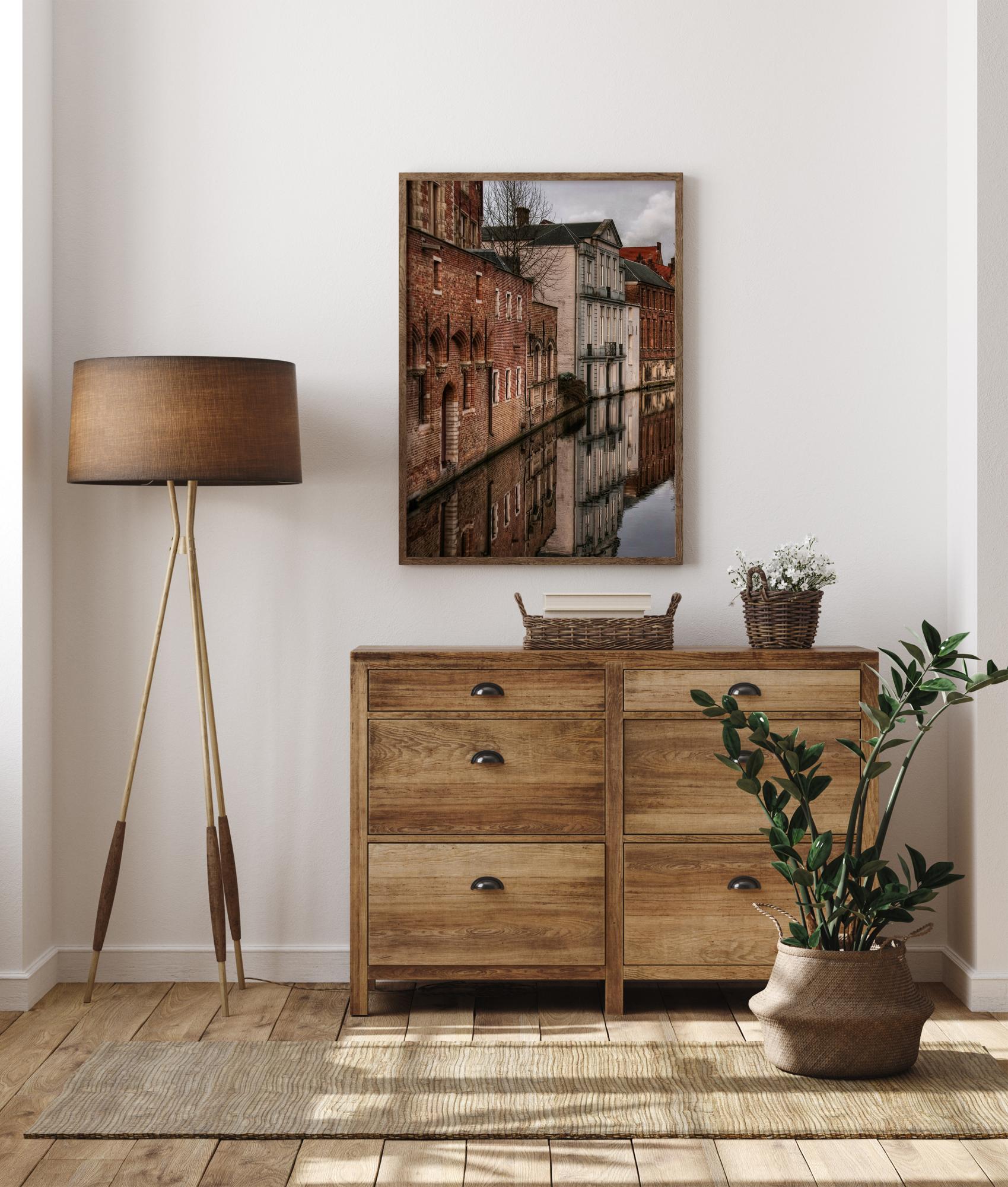 Nostalgijski plakat z vrsto starih hiš ob reki. Preproste, rustikalne, rdeče zidane hiše in njihove arhitekturne podrobnosti se odražajo v mirni vodi spodaj. Predstavljajte si, da plovete ob teh stavbah, medtem ko razmišljate o preteklosti.