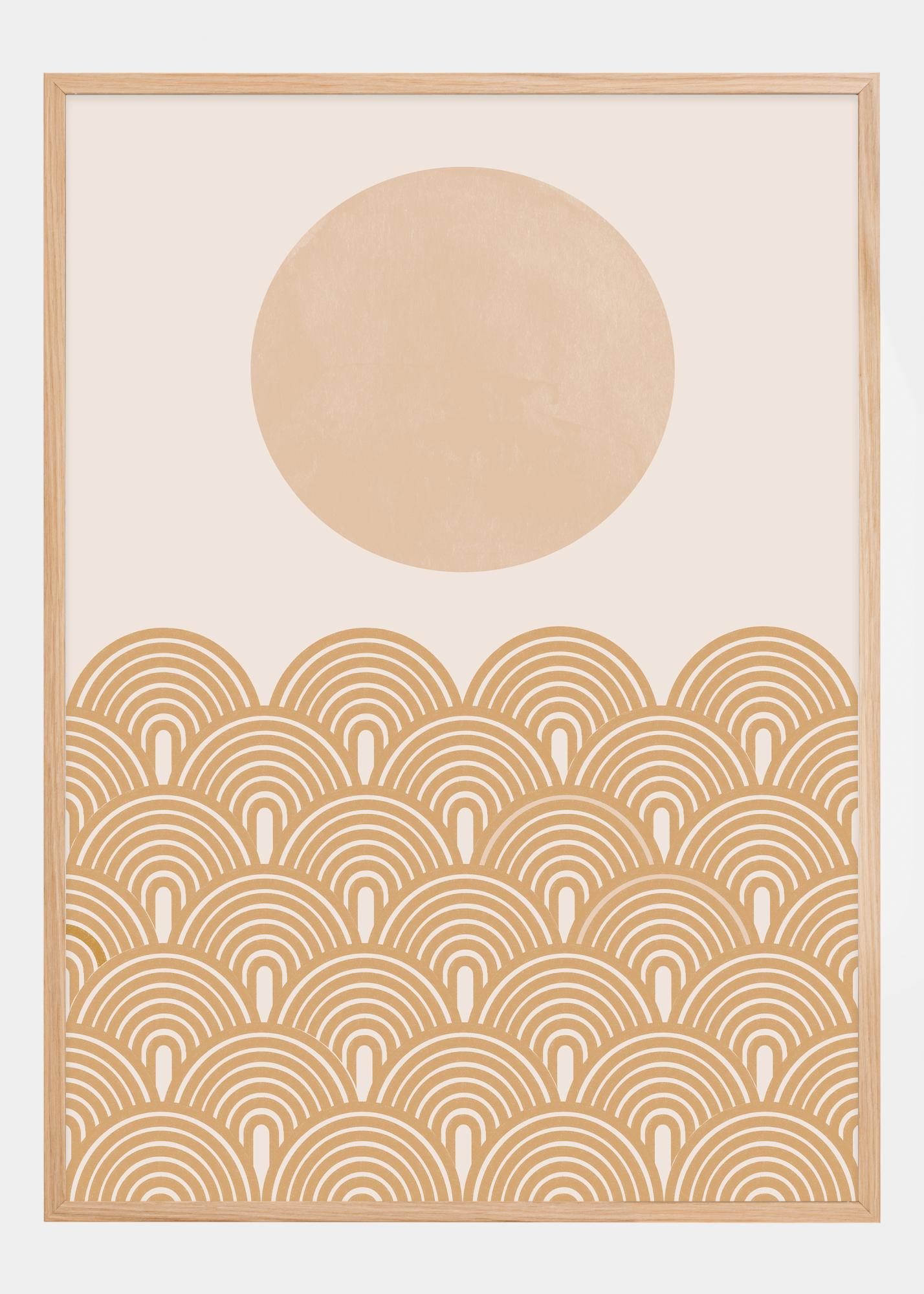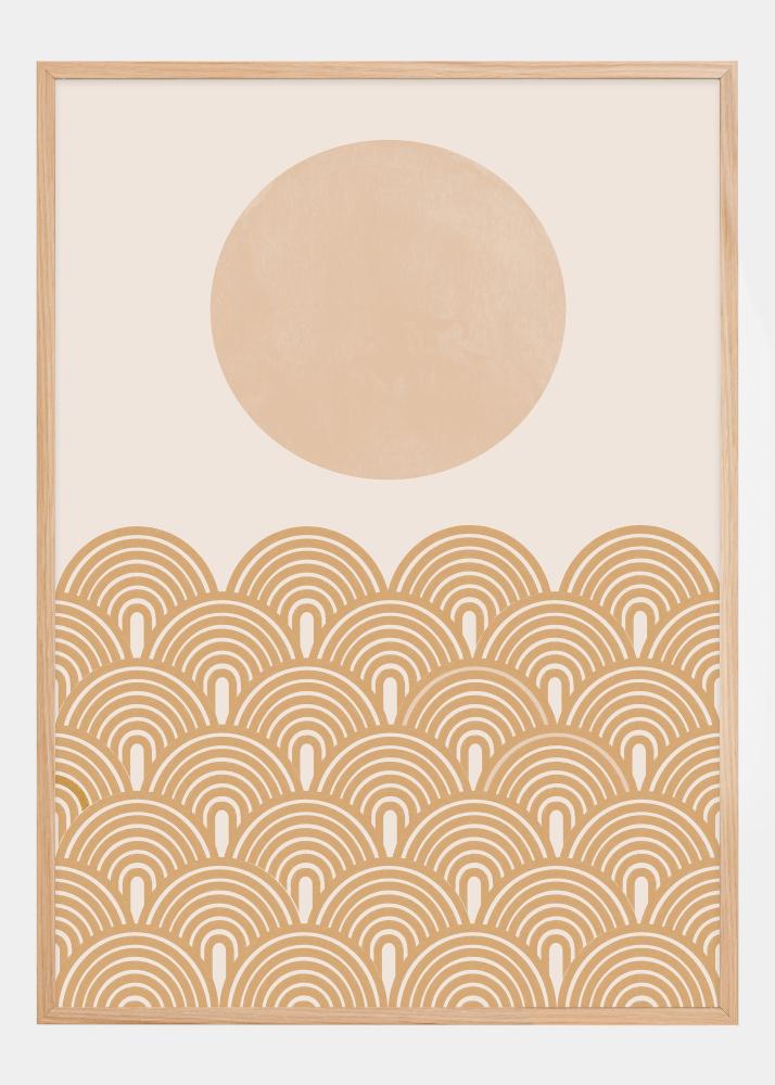 Ta plakat je sončna interpretacija retro stilov in poletnih vibracij, kjer velika bledorožnata krogla lebdi nad vzorcem elementov v obliki loka v toplem terakota tonu. Loke so povezane na način, ki spominja na valove ali hribčke, kar daje občutek gibanja in živahnosti. Mehka barvna shema prispeva k občutku topline in miru.