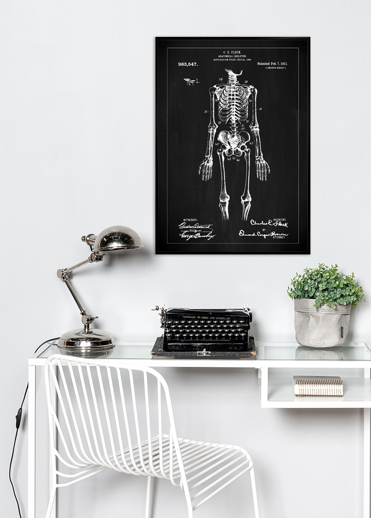 Ta fascinantna patentna plakat prikazuje patent številka 983547, odobren C. E. Flecku 7. februarja 1911, za anatomsko natančen model okostja. Vsaka kost in struktura sta spretno jedkana z belimi črtami na izrazito črnem ozadju, kar ima za rezultat vizualno podobo, ki je hkrati poučna in umetniška. To je spektakularna ilustracija, ki prikazuje čudeže in kompleksnost človeškega telesa.