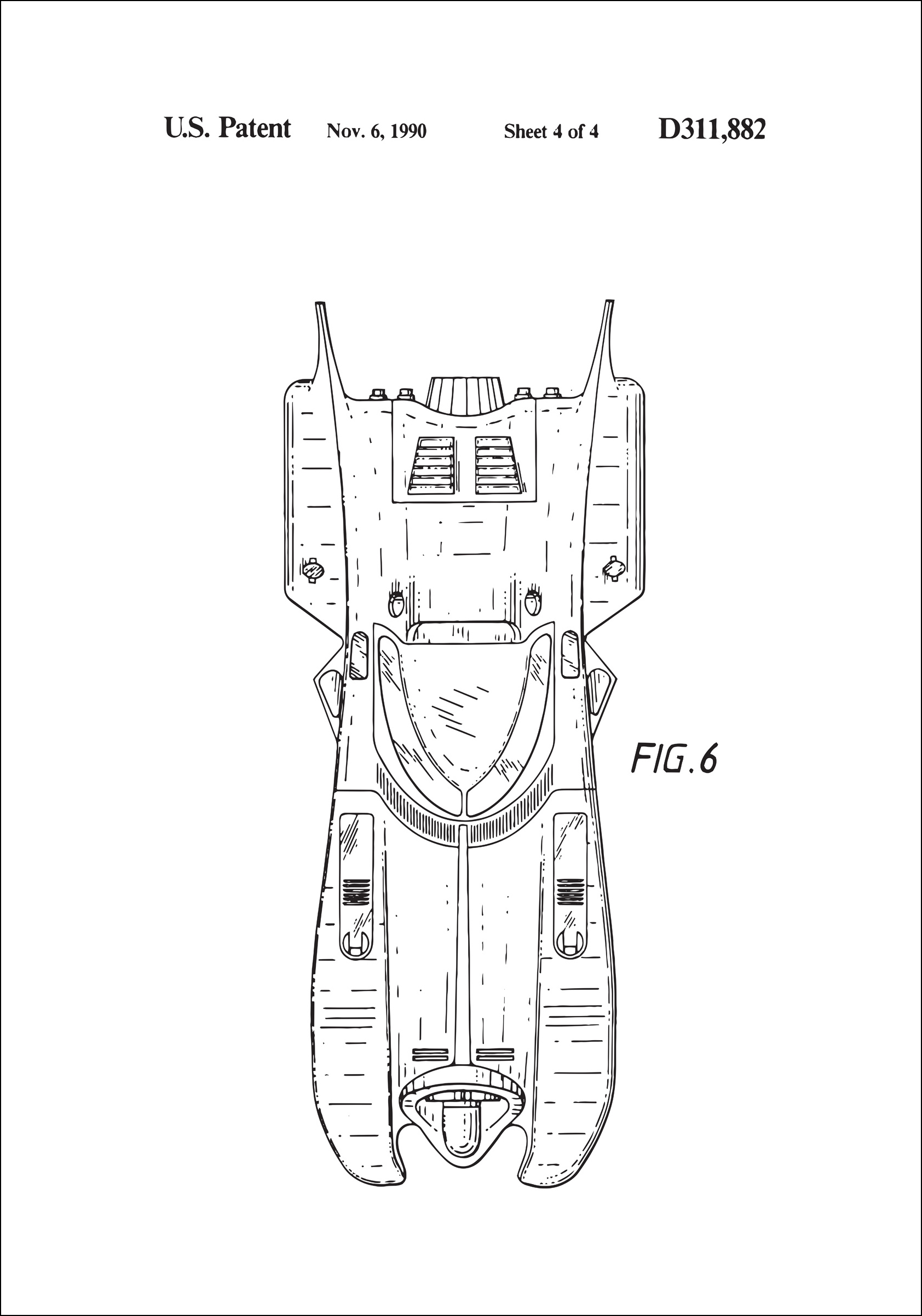 Ta patentni načrt se nanaša na ameriški patent številka D311,882, datiran 6. novembra 1990, kar je prikazano na samem načrtu. Je popolno darilo za navdušence tehnike in zgodovine, kot tudi za profesionalne izumitelje in oblikovalce, ki cenijo podrobno rokodelsko delo, potrebno za prenos ideje iz koncepta v resničnost. Ta patentni plakat je sofisticiran dodatek vsakemu domu ali pisarni, ki zagotavlja brezčasno estetiko, ki nikoli ne gre iz mode.