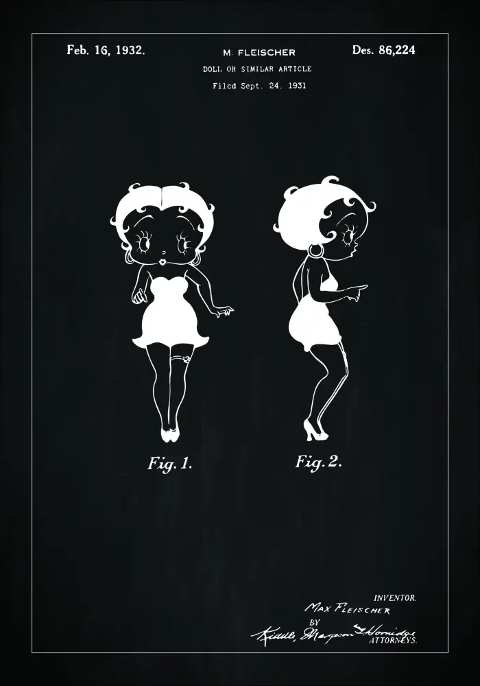 Ta očarljivi patentni poster prikazuje lutko, ki predstavlja Betty Boop, zasnovano od M. Fleischerja. Oblikovanemu patentu je bil dodeljen 16. februarja 1932 pod patentno številko Des. 86,224. Zahteva za patent je bila vložena 24. septembra 1931 in prikazuje dve figuri lutke, ena sprva in ena s strani, kar omogoča popoln vpogled v obliko in značaj lutke. Ta patentni dokument ujema značilen stil in osebnost, ki sta bila v tistem času priljubljena.