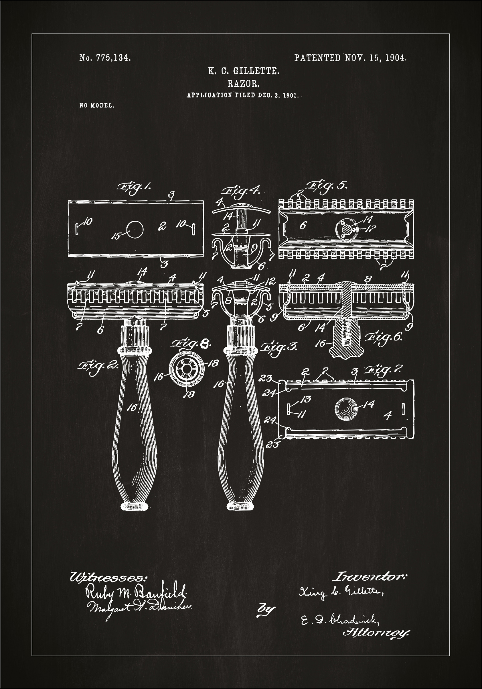 Ta patentna plakat ponuja ekskluziven vpogled v oblikovanje enega najbolj osnovnih orodij za osebno nego, namreč britvice. Patent, ki je bil podeljen K.G. Gillette 15. novembra 1904 pod številko 775.134, prikazuje revolucionarno spremembo v načinu, kako so ljudje izvajali svojo vsakodnevno rutino britja. Gre za podrobno patentno risbo, ki prikazuje različne perspektive in komponente, ki so bile v tistem času inovativne.