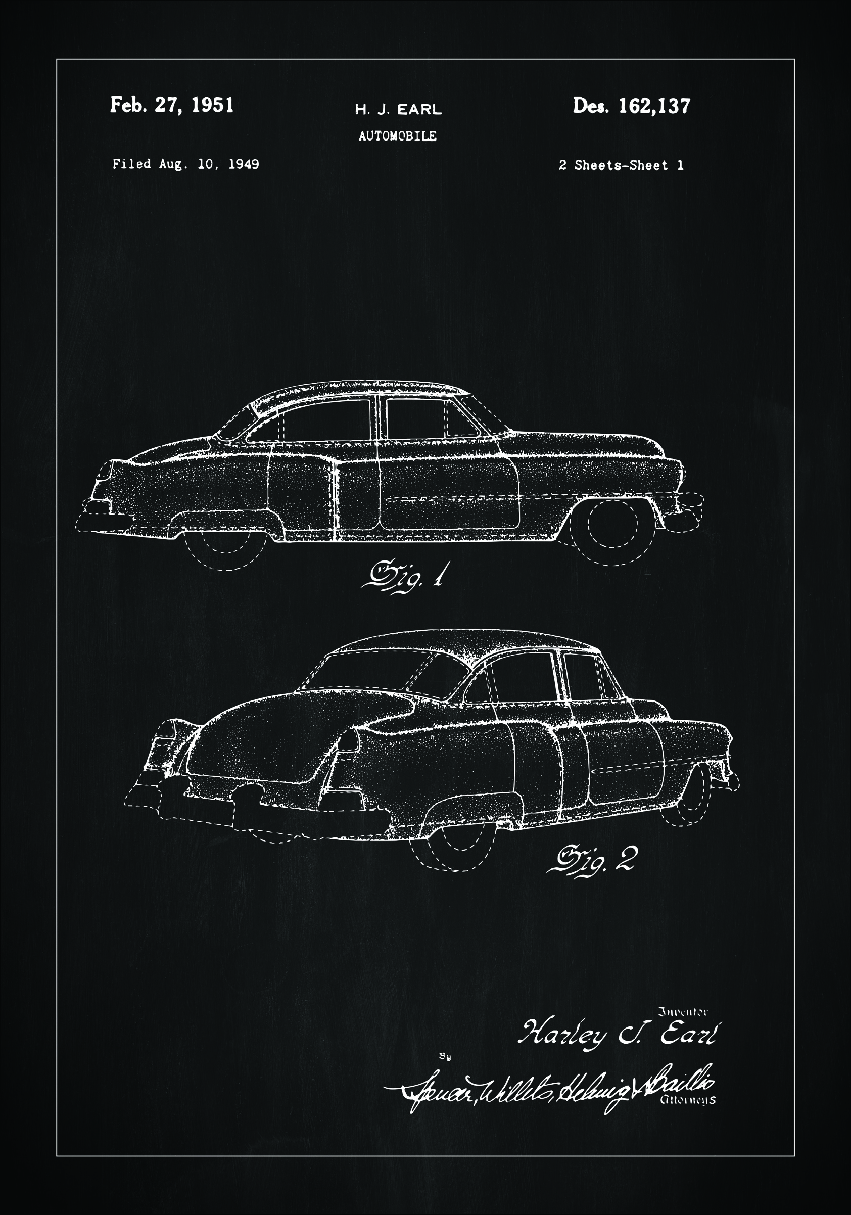 Ta patentna posterja predstavlja eleganten prikaz Cadillaca, patentiranega 27. februarja 1951 s strani H.J. Earla pod patentno številko Des. 162,137. Podrobnosti te risbe, predložene 10. avgusta 1949, ujamejo dinamično obliko in inovativno zasnovo, ki je postala značilna za tisto obdobje avtomobilske industrije. Stranski pogled in tridimenzionalni kot nudita edinstven vpogled v proporce avtomobila in oblikovanje karoserije ter prikazujeta slog in lepoto, ki sta bila izrazita v petdesetih letih prejšnjega stoletja.
