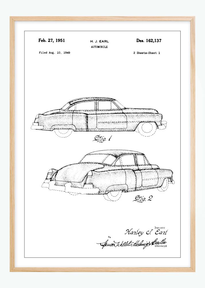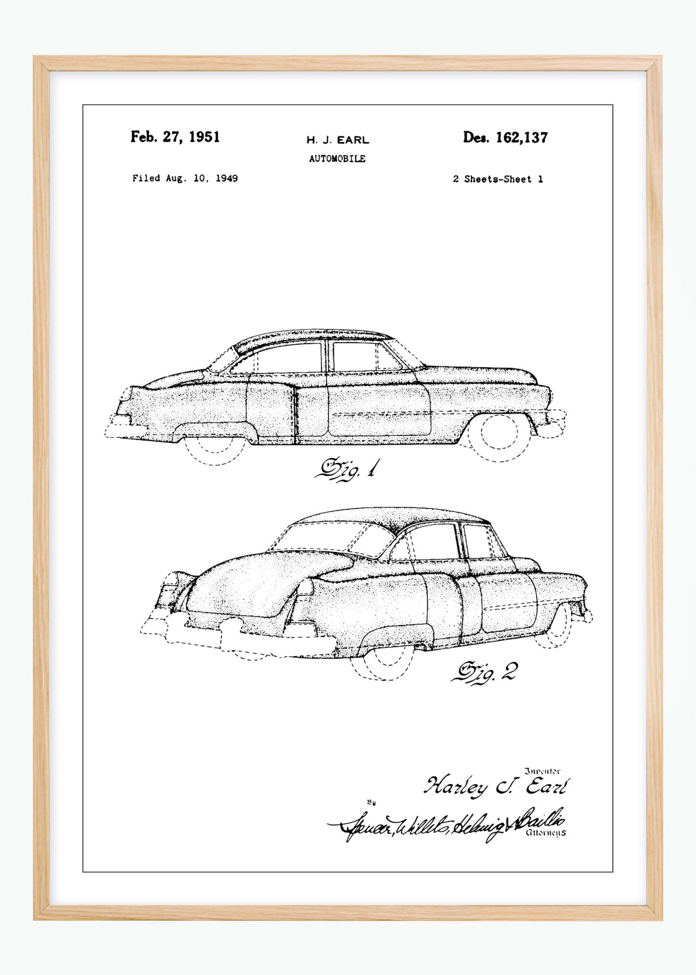 Ta patentni poster predstavlja sofisticirano risbo avtomobila Cadillac, ki ga je zasnoval slavni H.J. Earl. Datiran na 27. februar 1951, s patentno številko Des. 162,137, ki je bila prvotno vložena 10. avgusta 1949, ta podoba zajame bistvo povojne avtomobilske industrije. Motiv je poklon zlati dobi ameriškega avtomobila in je izdelan z pozornostjo do podrobnosti, ki privlači tako proizvajalce avtomobilov kot ljubitelje dizajna.
