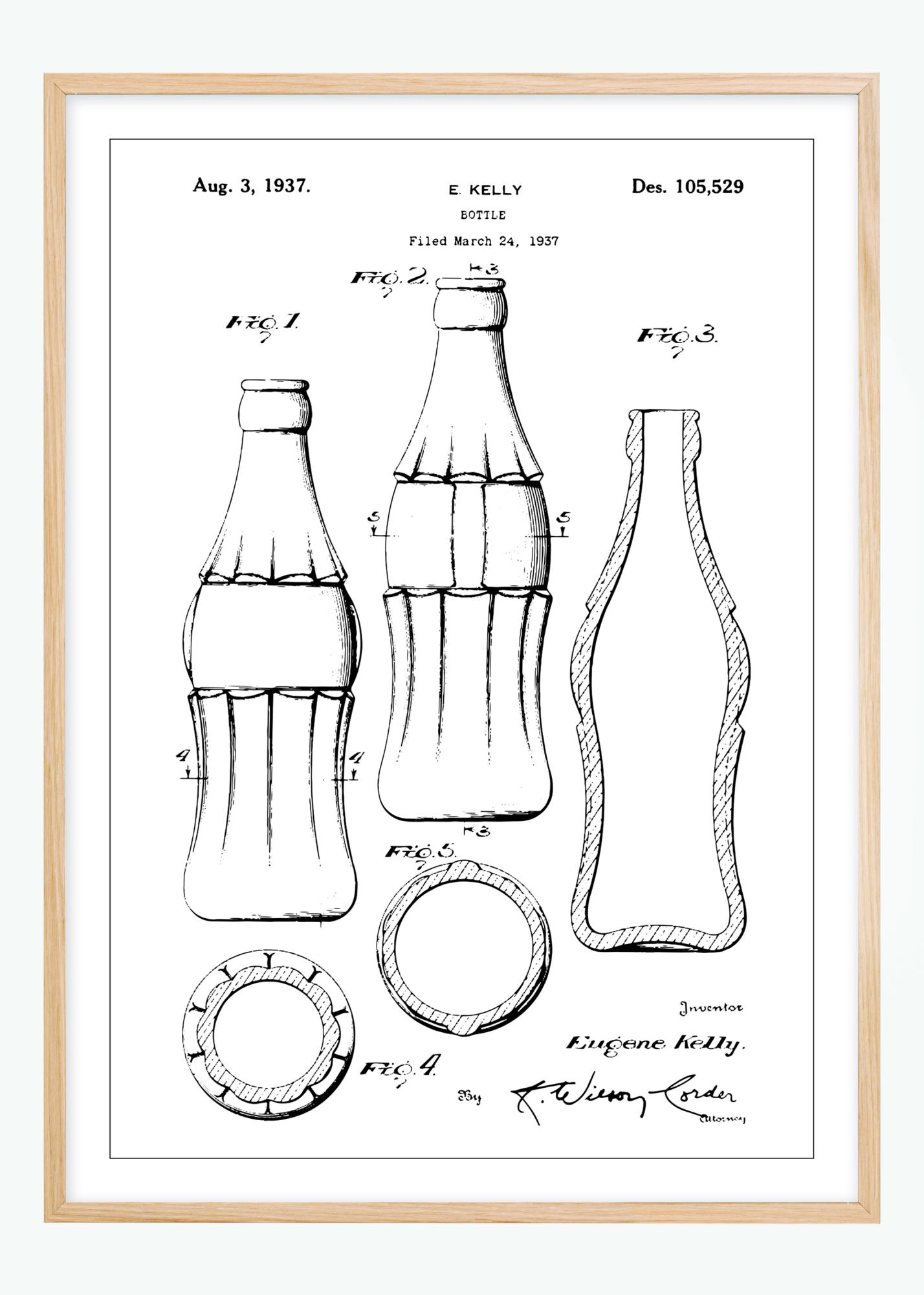 Ta plakat patenta prikazuje dizajn steklenice CocaCola, ki je bil dodeljen E. Kellyju 3. avgusta 1937 pod številko patenta Des. 105,529. Ilustracija prikazuje podrobne konture in proporce steklenice iz več kotov, kar daje celovit pogled na dizajn. Ikonična oblika steklenice je postala sinonim za izdelek, ki ga vsebuje, in je brezčasen prikaz blagovne znamke in oblikovanja izdelkov.