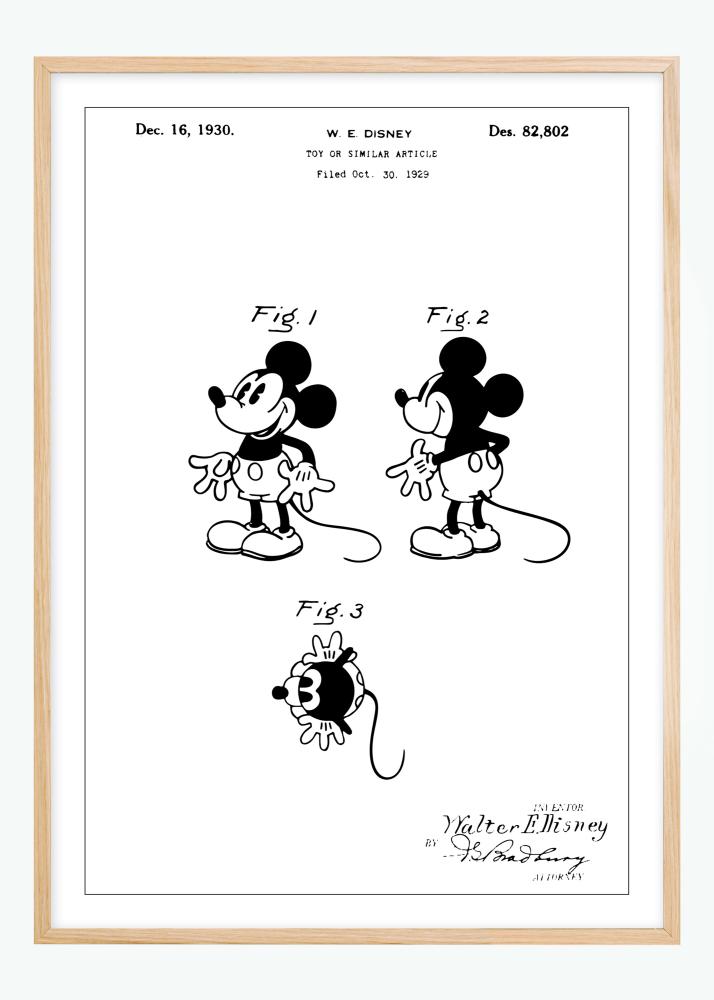 Ta patentna plakat prikazuje Mikija Miško, oblikovanega s strani W.E. Disneyja in odobrenega 16. decembra 1930 pod patentno številko Des. 82,802. Tri ilustracije predstavljajo različne poglede na lik, ki prikazujejo ikonične lastnosti in čarobnost dizajna. Ta motiv je pomemben dokument iz časa, ko je oblikovanje igrač začelo igrati večjo vlogo v popularni kulturi in množičnih medijih.