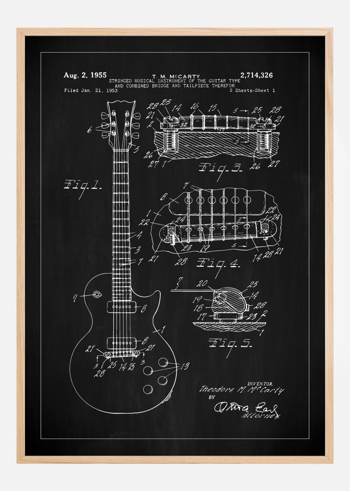 Od glave do telesa je vsak del kitare natančno oblikovan in oštevilčen, da poudari njegove komponente in podrobnosti konstrukcije, vključno s kombiniranim mostom in sedlom. Ta patentna risba je poklon glasbeni inovaciji in oblikovanju ter je nujna za vse ljubitelje glasbe in zbiratelje glasbene zgodovine. Kot stenska umetnost ta patentni plakat ne ponuja le estetskega užitka, temveč tudi priznanje tehničnemu napredku, ki je oblikoval glasbeno industrijo.