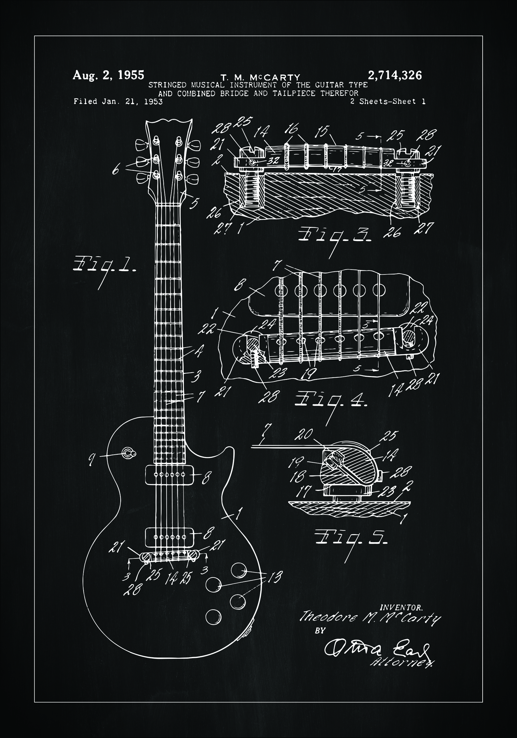 Ta patentna risba prikazuje klasičen dizajn godalnega glasbila, posebej električno kitaro, z datumom 2. avgust 1955 in patentno številko 2.714.326. Patent je bil vložen 21. januarja 1953, avtor pa je Theodore M. McCarty, ter predstavlja elegantno obliko in iznajdljivo mehaniko dizajna kitare. Ilustracija s podrobnim pogledom na sprednjico instrumenta, prerez in podrobnosti komponent prikazuje brezčasno lepoto in obrtništvo za tem glasbilom.