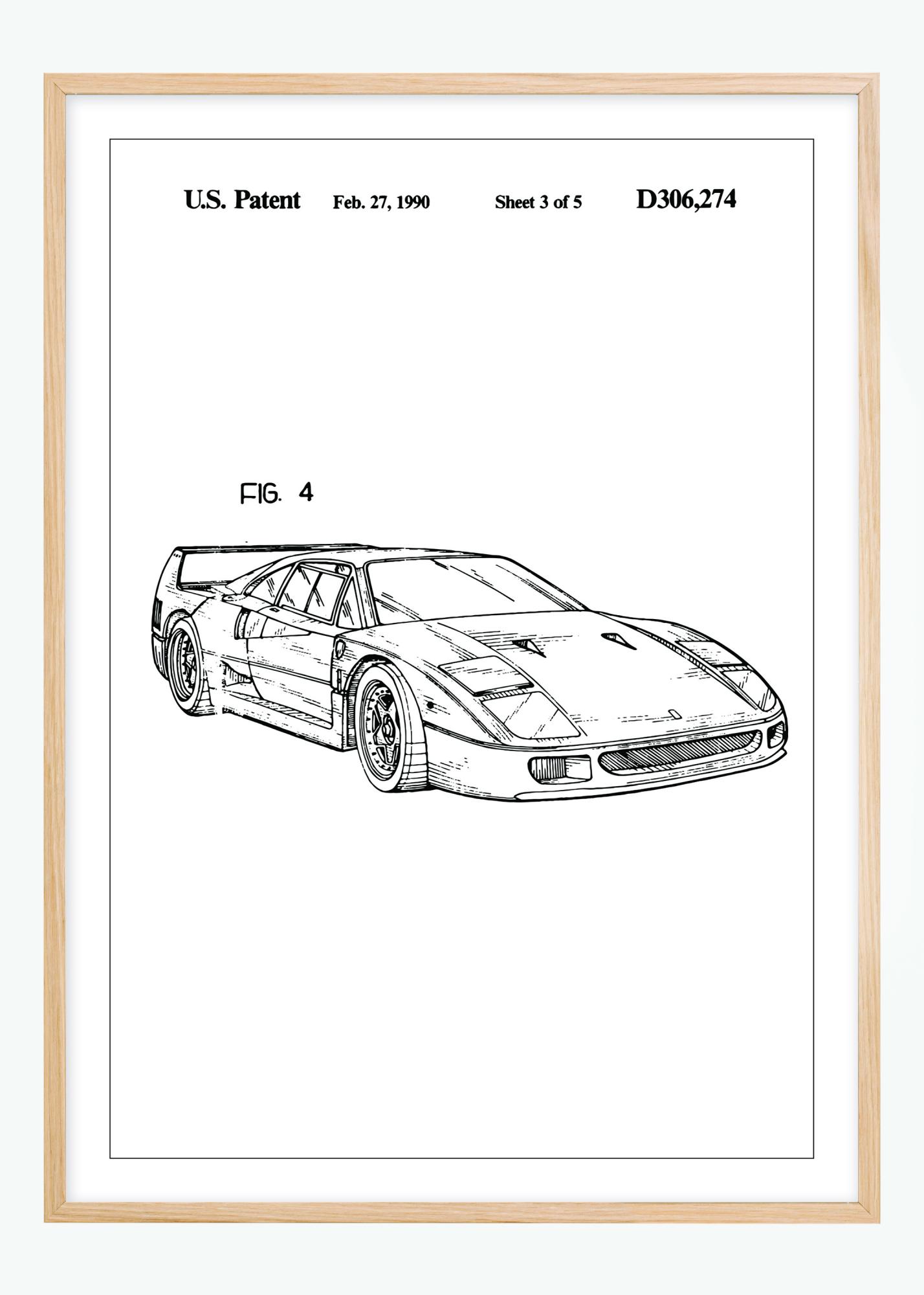 Ta patentna plakat prikazuje prelomno zasnovo Ferrari F40, podrobno izdelano 27. februarja 1990, pod patentno številko D306,274. Ilustracija prikazuje stran, ki bo postala ena izmed najbolj ikoničnih športnih avtomobilov v zgodovini, znana po svoji aerodinamiki in prepoznavnem slogu. To je slika inovacije in napredka v avtomobilski industriji, ki ujame gledalčevo oko s svojimi ostrimi linijami in dinamično obliko.