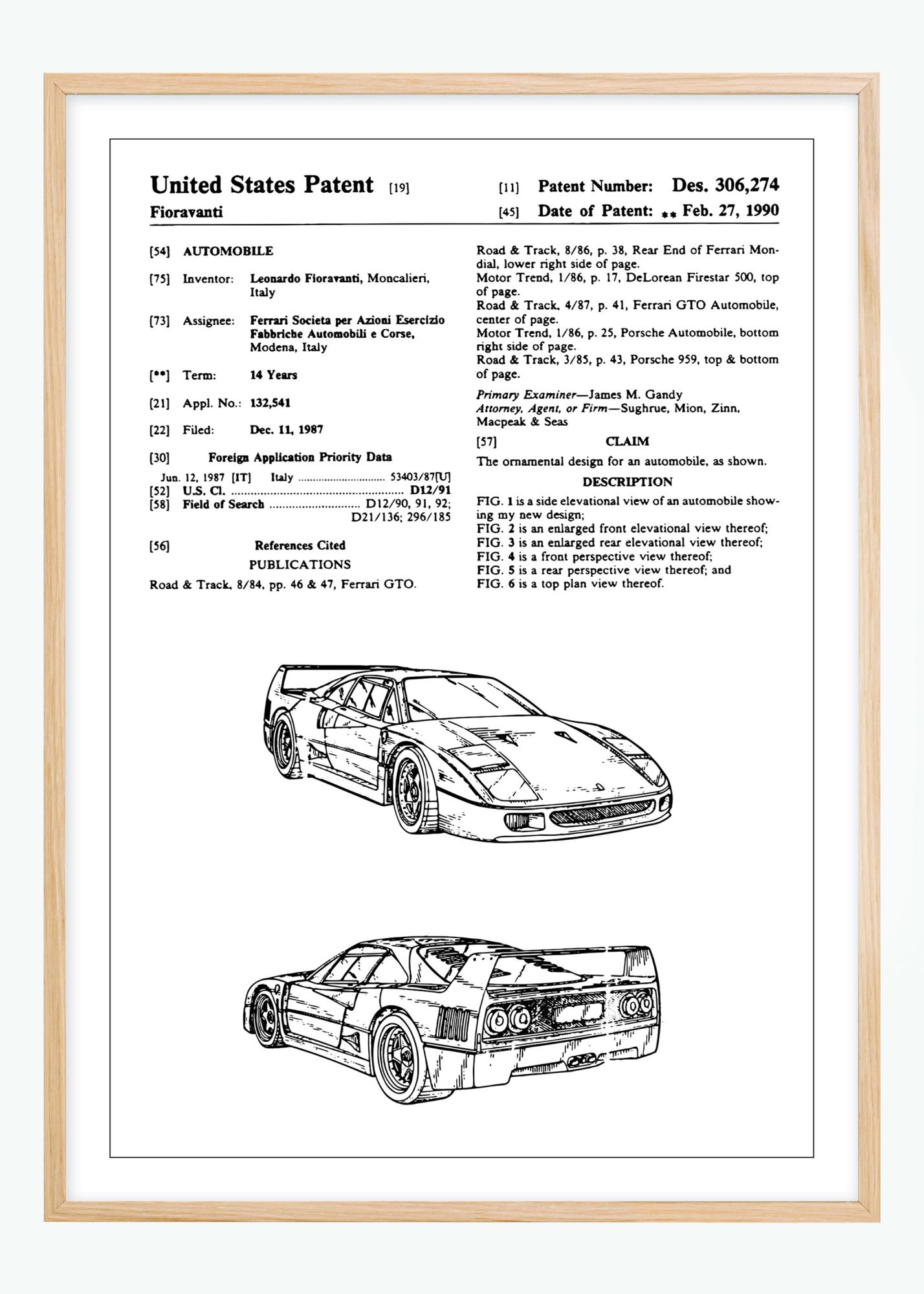 Ta elegantna patentna risba prikazuje avtomobil, ki ga je oblikoval Leonardo Fioravanti za Ferrari, eno najbolj ikoničnih imen v avtomobilski industriji. Patent je bil odobren 27. februarja 1990 pod številko patenta Des. 306,274 in predstavlja estetsko zasnovo Ferrari F40, ki ujame bistvo hitrosti in inovacij. Ilustracije patenta poudarjajo osupljive linije in aerodinamično silhueto, ki so postale sinonim za znamko.
