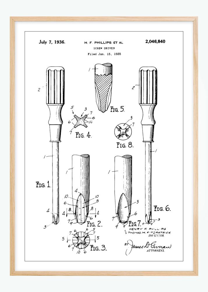 Predstavljena tukaj je klasična patentna plakat, ki prikazuje obliko izvijača, nepogrešljivega orodja v vsakem mojstrskem orodjarni. Datumiran na 7. julija 1936 in arhiviran 15. januarja 1935, ta patentni plakat z natančnimi detajli prikazuje konstrukcijo in inovacijo za orodjem, od njegovega ikoničnega ročaja do edinstvene oblike konice. Izumitelji H.F. Phillips in drugi so s tem patentom, številka 2,046,840, ustvarili standard v orodje industriji, na katerega se še vedno zanašamo danes.