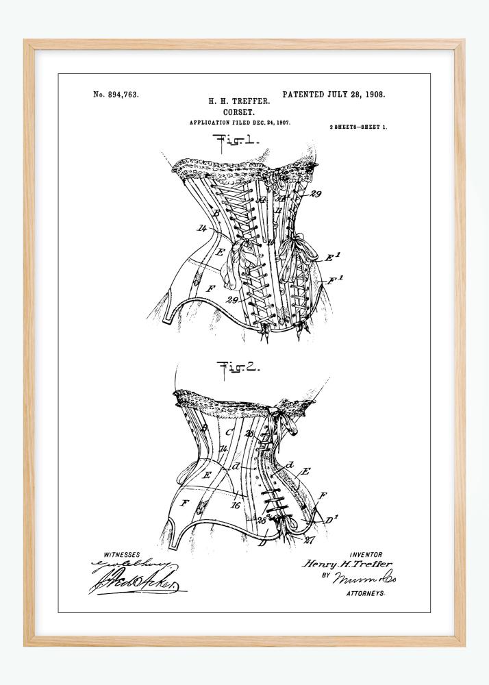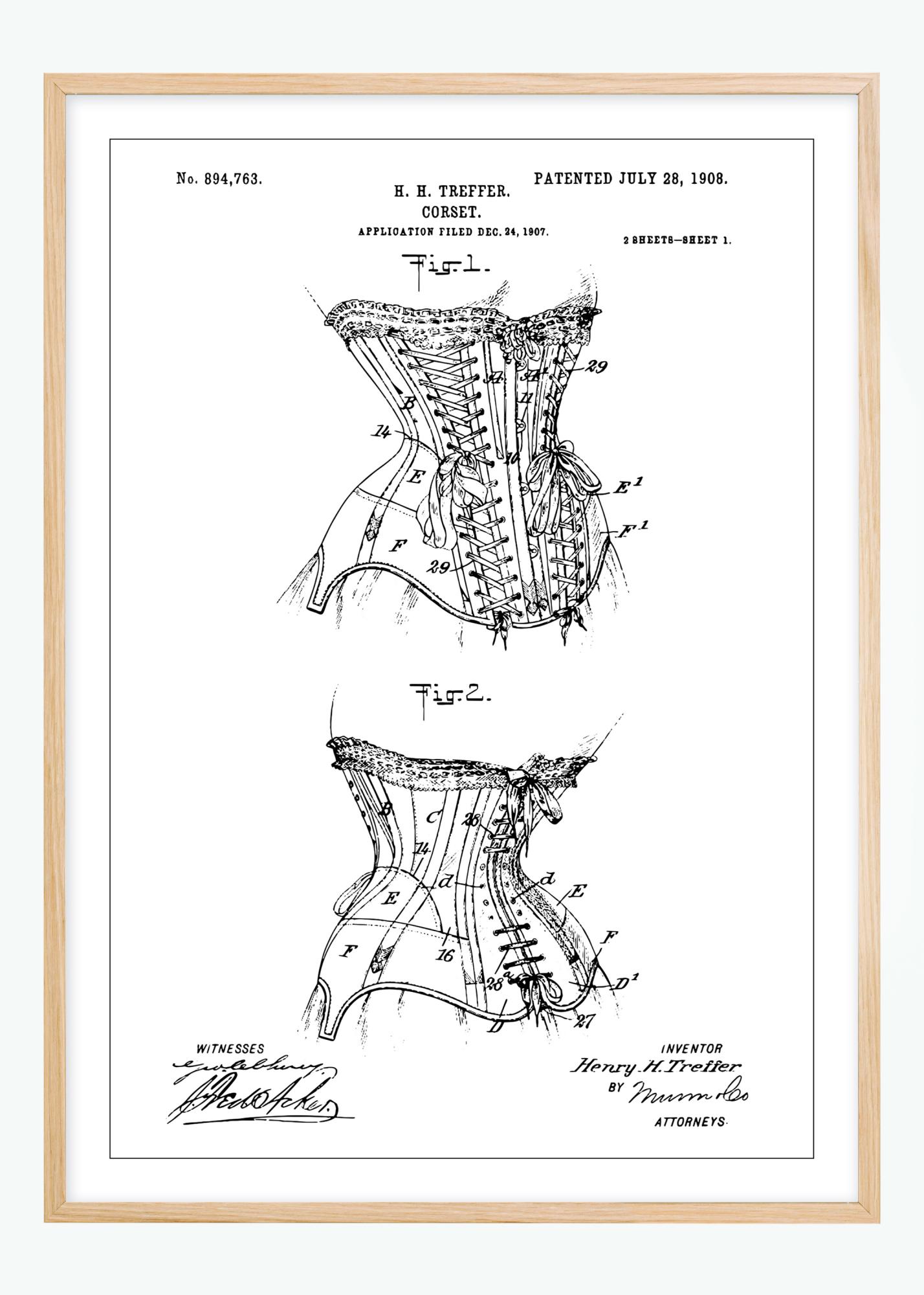 Ta patentna plakat upodablja risbo steznika, inovacijo v modnem oblikovanju, patentirano Henryju H. Trefferju 28. julija 1908, s številko patenta 894,763. Ilustracije prikazujejo podrobno zasnovo steznika z njegovim zavezovanjem in strukturo, kar poudarja oblikovanje oblačil tistega časovnega obdobja in njegovo osredotočenost na silhueto in obliko.