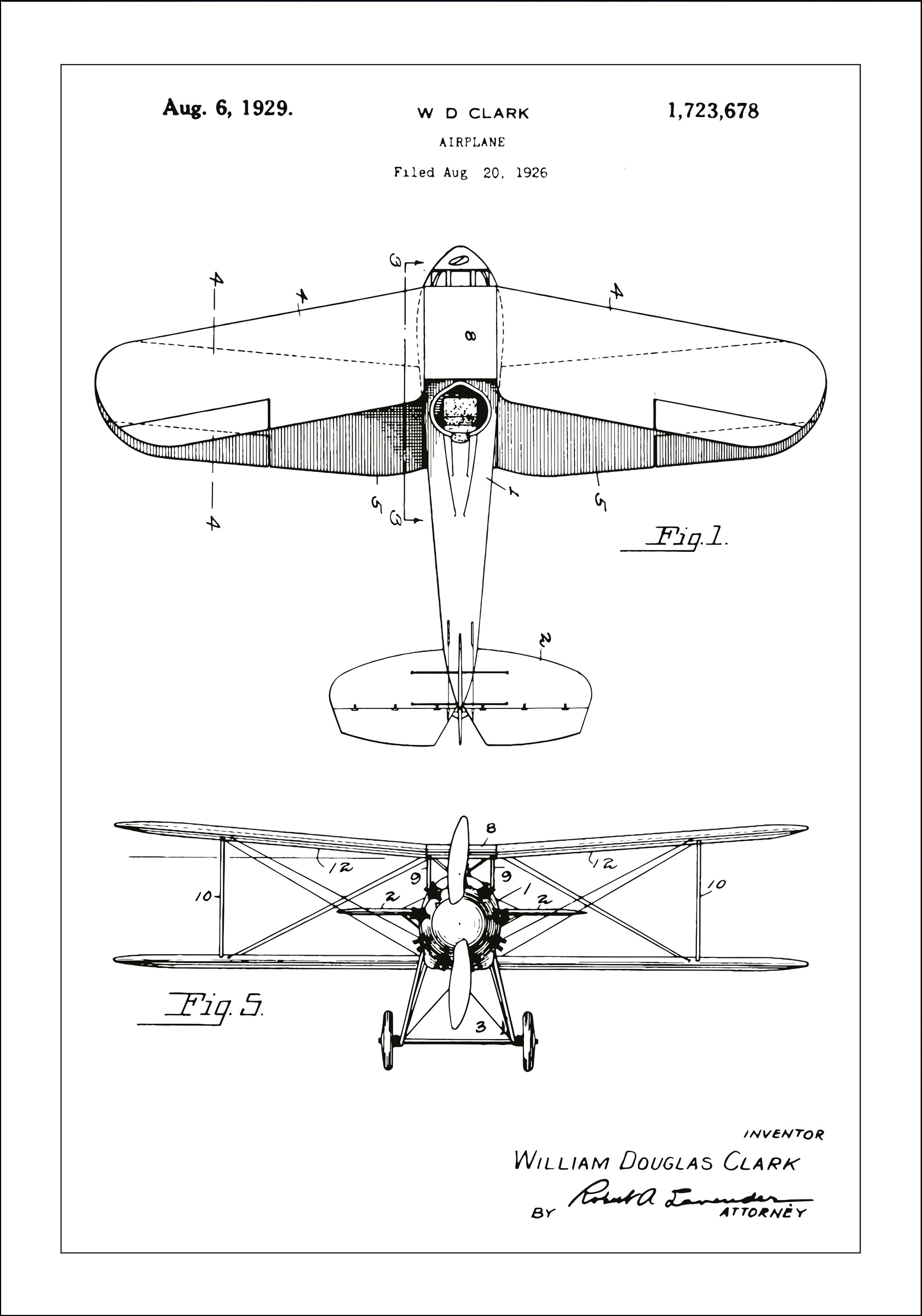 S klasično preprostostjo ta patentni plakat ujame oblikovanje letala W D Clarka, oblikovanje, ki pooseblja duh zgodnje letalstva. Patent dodeljen 6. avgusta 1929 pod številko 1,723,678, ta ilustracija je časovna kapsula inovacij. Čiste linije in ostri detajli plakata počastijo tehnični napredek, ki je bil ključnega pomena za prihodnost letalstva.