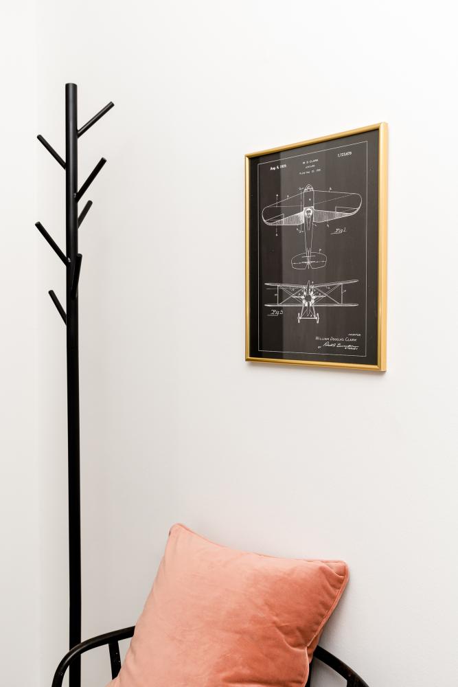 Ostre bele črte plakata proti temnemu črno-modremu ozadju zagotavljajo jasno in podrobno ilustracijo letalske konstrukcije ter ustvarjajo vizualni poudarek na steni. To je idealna stenska dekoracija za vse letalske navdušence in zbiratelje zgodovinskih inovacij, nujna pridobitev za tiste, ki cenijo pionirsko inženirstvo zgodnjega 20. stoletja.