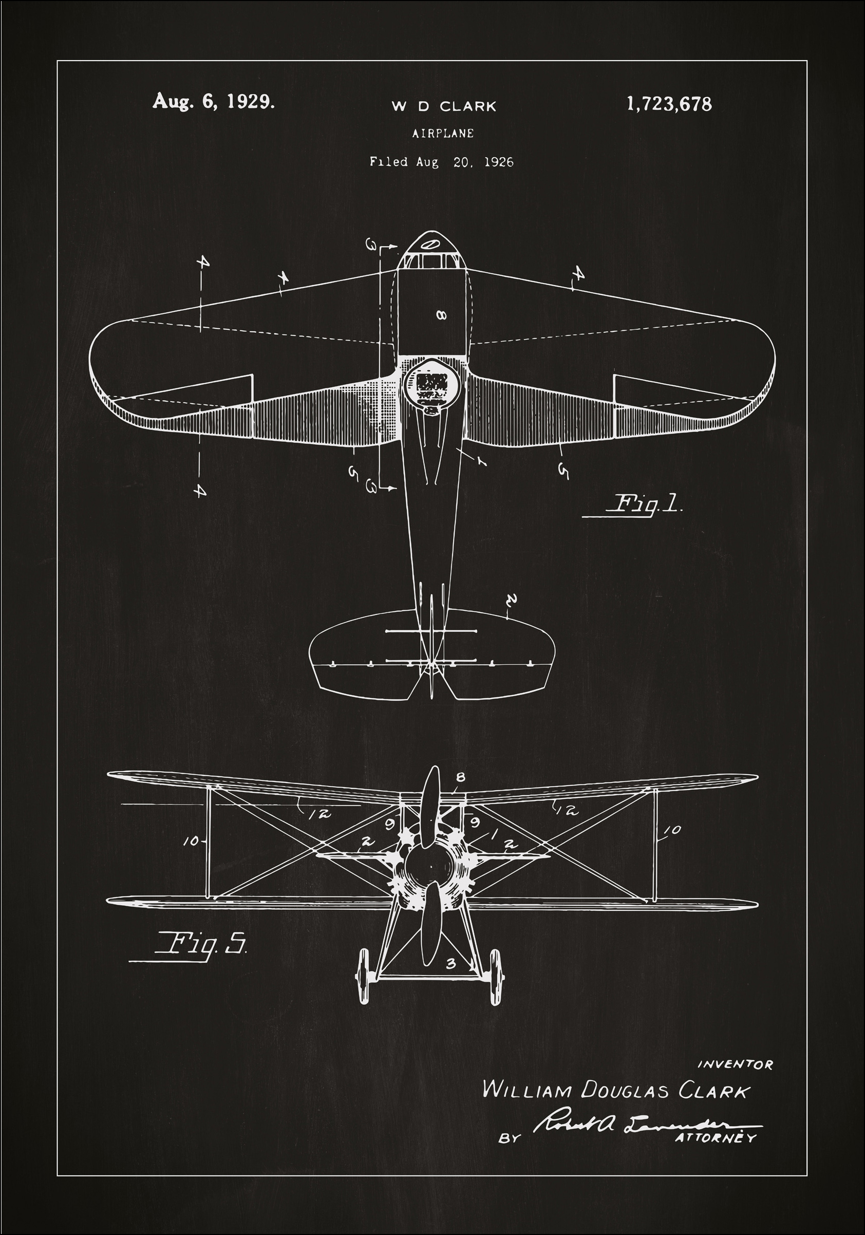 Iz neba v vaš dom, ta patentni plakat prikazuje načrt letala W D Clarka, pionirsko stvaritev, ki ji je bil dodeljen patent številka 1,723,678 dne 6. avgusta 1929. To je resnična predstavitev duha časa, ko je letalska tehnika doživela velik napredek. Ta natančna upodobitev originalnih risb je poklon tisti dobi inovacij.
