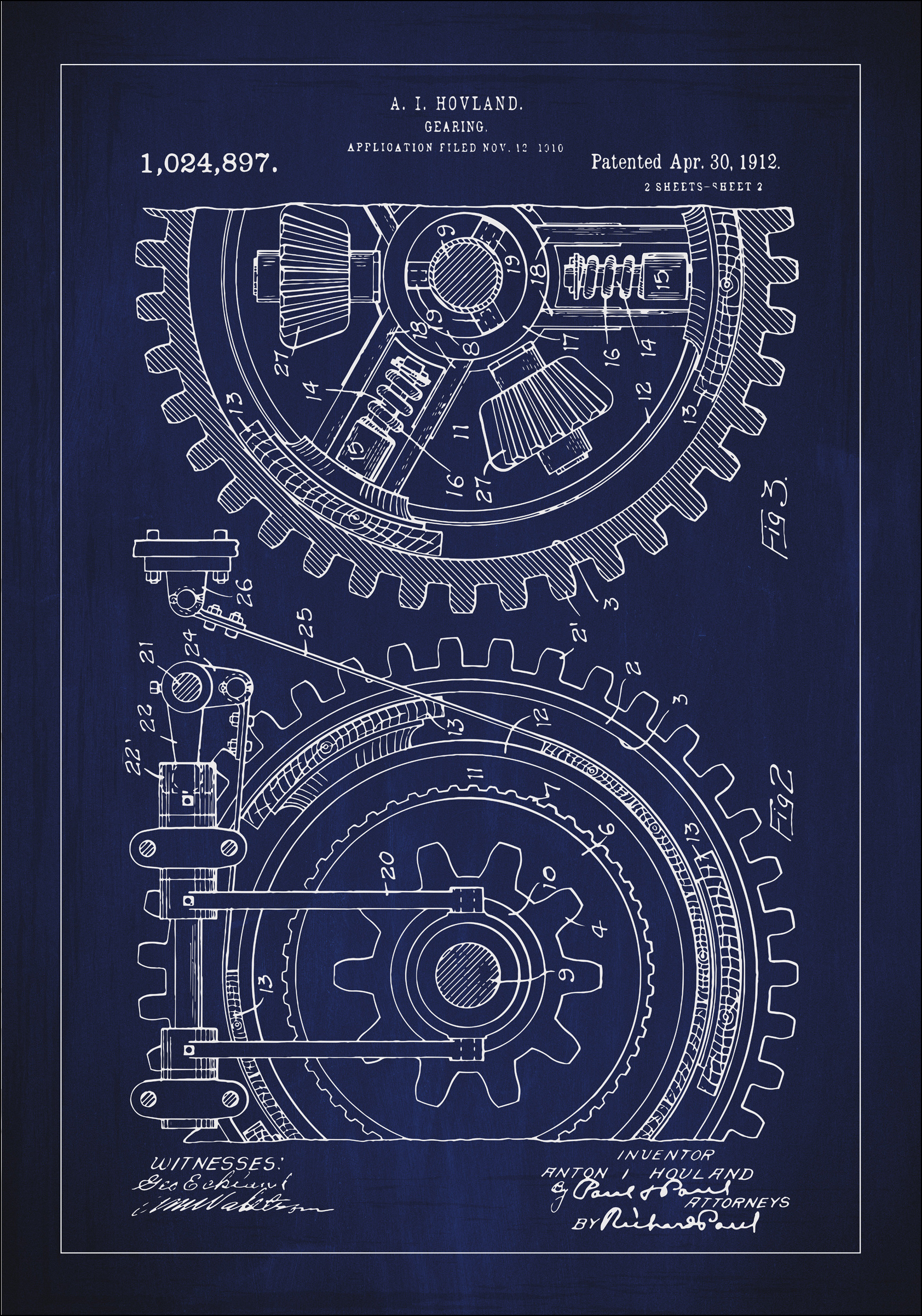 Okrasite svoj prostor s tem elegantnim patentnim plakatom, ki podrobno prikazuje izum A. I. Hovlanda za mehanizem menjalnika, patentna številka 1.024.897, odobrena 30. aprila 1912. To zapleteno delo tehničnega risanja osvetljuje obdobje inovacij in mehanske konstrukcije. S svojim drzno nasprotjem in zapletenimi ilustracijami je to očarljiv dodatek za inženirsko pisarno, delavnico ali katero koli industrijsko okolje, kjer se cenijo strojna oprema in dizajn.