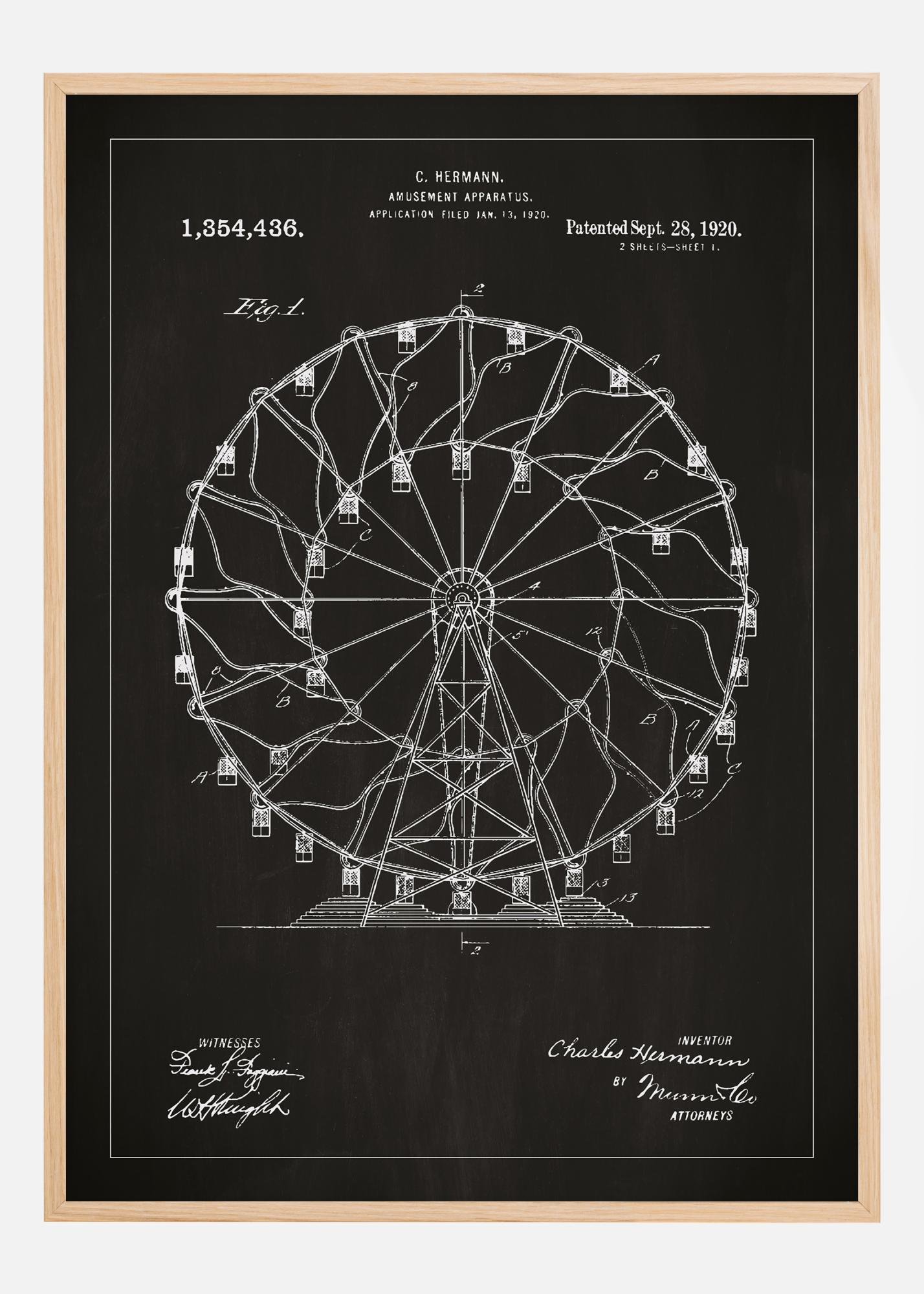 Ta patentna plakatna predstava C. Hermannovo klasično konstrukcijo zabaviščnega parka, specificirano v patentu s številko 1,354,436, izdanem 28. septembra 1920. S svojo podrobno predstavitvijo panoramskega kolesa ta risba simbolizira obdobje igrive inovacije in je odlična dekoracija za vse, ki imajo srce za zgodovinsko zabavišče in tehniko. Njena zapletena zasnova in natančne podrobnosti ujamejo pozornost in dajejo nostalgičen občutek.