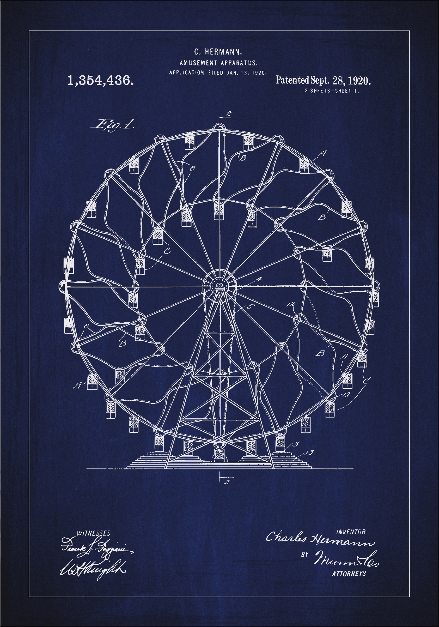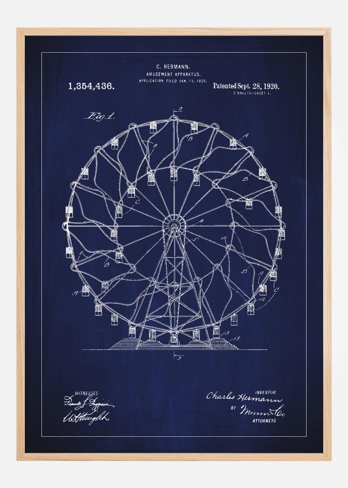 Pretvorite katero koli steno v poklon klasičnemu inženiringu s to patentno posterjem iz zasnove C. Hermanns za zabaviščni atrakcijo, specificirano v patentni številki 1,354,436, dodeljeni 28. septembra 1920. Ta spretno ustvarjena ilustracija vrtiljaka ni le dekorativno umetniško delo, temveč tudi predstavitev časa, ko so zabave postale tehnični podvigi. Podrobnosti konstrukcije ujamejo preteklo dobo zlate dobe zabaviščnih parkov in mojstrovine mehanske umetnosti.
