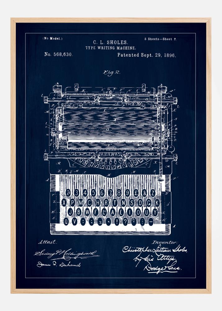 Občudujte ta značilen patentni plakat, ki prikazuje zgodovinsko iznajdbo pisalnega stroja, patent številka 568,630, odobren C. L. Sholesu dne 29. septembra 1896. Ta patentna risba ni le vizualna predstavitev zgodnje pisalne naprave, temveč tudi kos komunikacijske zgodovine, predstavljen tukaj v bleščeči beli liniji na mornarsko modrem ozadju, kar ustvarja močan in privlačen kontrast.