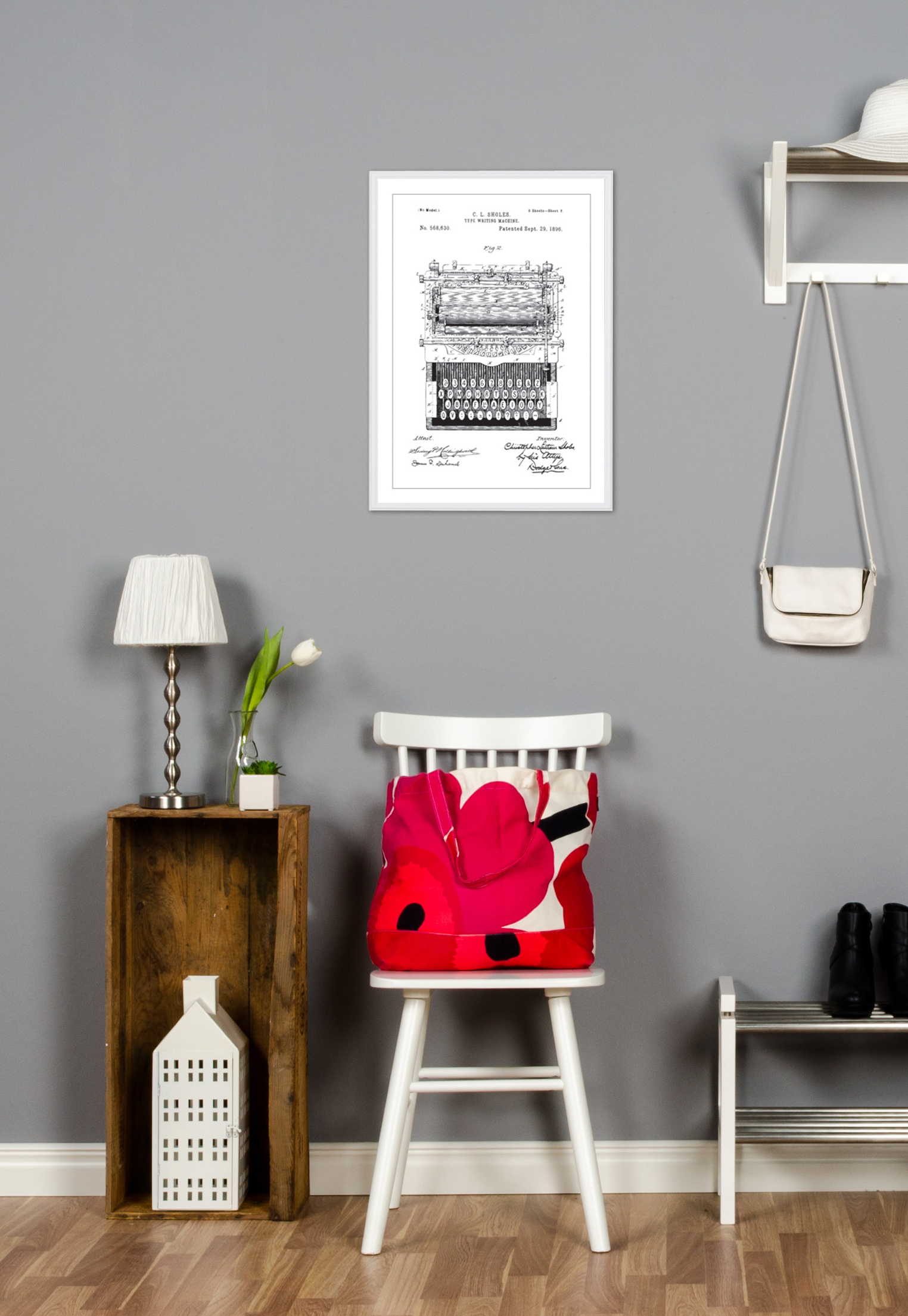 FIG. 2 prikazuje zapleten notranji pogled na pisalni stroj, vključno z njegovo tipkovnico in mehaničnimi podrobnostmi. Podpis izumitelja Sholesa, skupaj z lastnoročnimi podpisi dveh prič, doda avtentičen in oseben vidik tej patentni plakati. Gre za odlično temo pogovora za vsakogar, ki ga zanimata tehnologija in zgodovina, in bi se odlično podala na stene pisarne, knjižnice ali zbirateljskega prostora.
