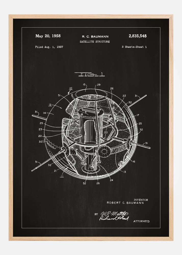 Z ostrimi belimi linijami, ki se razlikujejo proti globoki črni ozadju, ta patentni plakat ponuja fascinanten vpogled v zgodovinsko tehnologijo in je impresiven dekorativni kos za vse, ki imajo strast do vesolja, znanosti in zgodovinskih inovacij. Gre za navdihujoč opomnik človekovega prizadevanja za raziskovanje onkraj našega planeta in bi bil spektakularna podrobnost v kateremkoli prostoru.