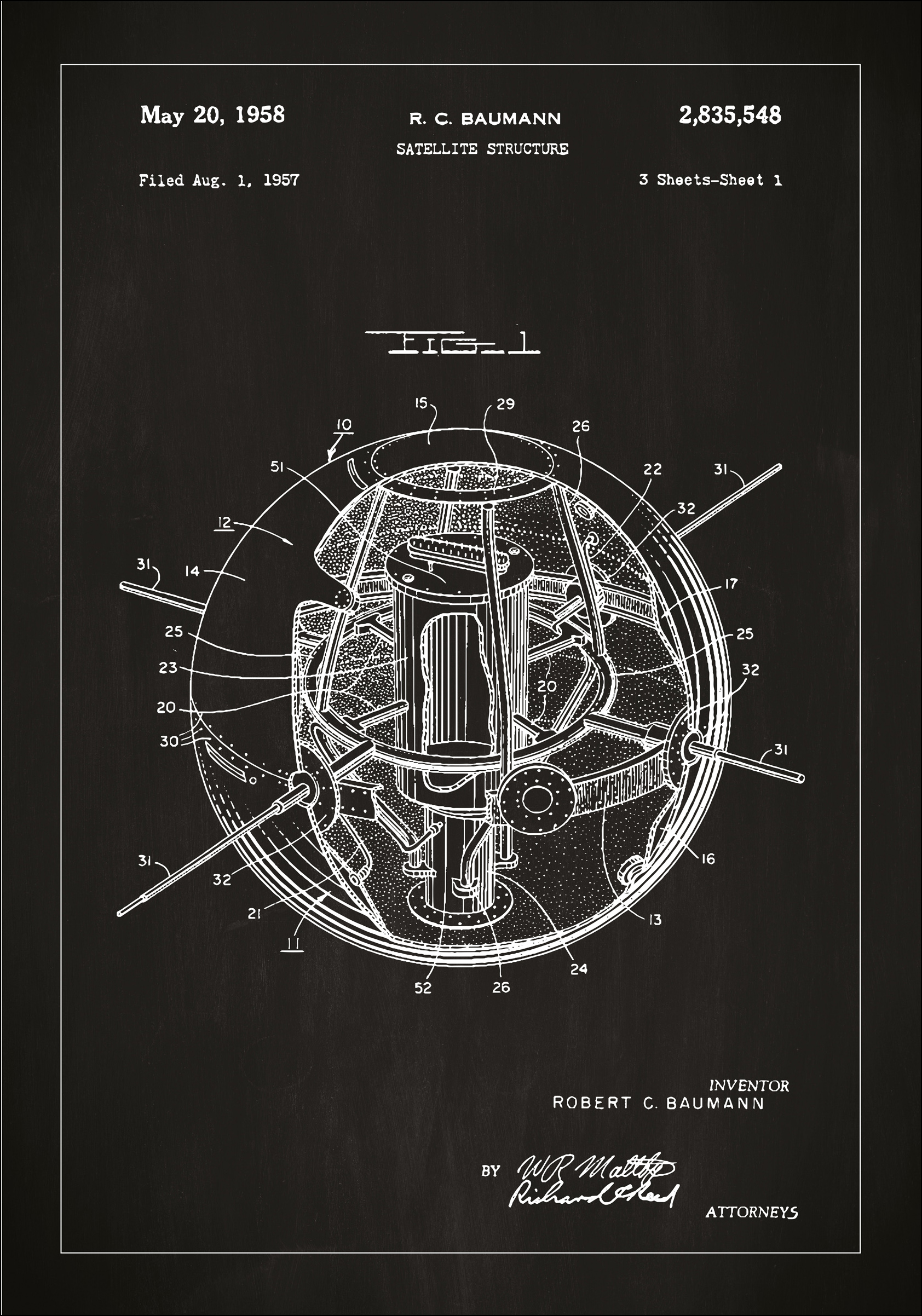 Ta izjemen patentni plakat prikazuje revolucionarno zasnovo v zori vesoljske tehnologije: R.C. Baumannov "Satelitska struktura", patentiran 20. maja 1958, s patentno številko 2.835.548. Vložen 1. avgusta 1957, ta podrobna patentna risba prikazuje zgodnji model umetnega satelita, skupaj z njegovimi komponentami in edinstvenimi geometričnimi konfiguracijami, razkriva inovativni duh v dobi vesoljske tekme.