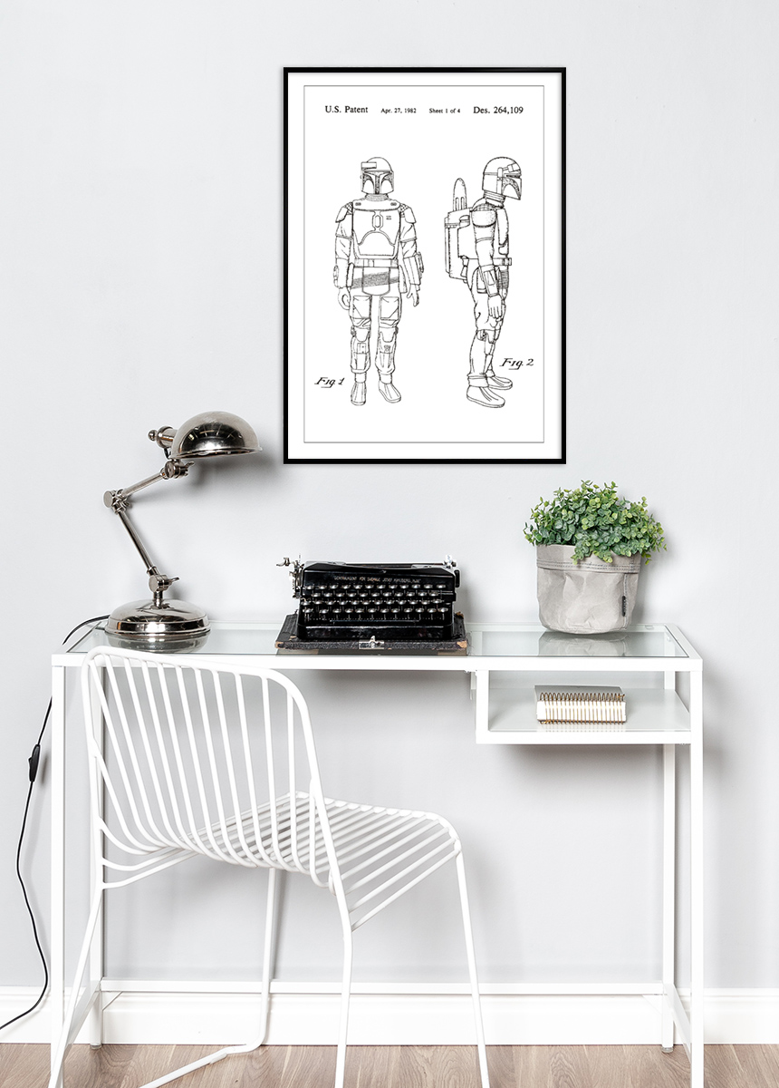 Impresionirajte s koščkom zgodovine na svoji steni s to sofisticirano patentno posterjo, ki prikazuje ikoničen oklep Boba Fett iz Vojne zvezd. Oblikovana za avanture, ki presegajo vsakdan. Ta natančna reprodukcija ameriškega patenta, oštevilčenega Des. 264,109 in datiranega 27. aprila 1982, je poklon brezčasni inovaciji in oblikovalskemu geniju. Idealna za dodajanje umetniškega in industrijskega pridiha v pisarno ali domačo knjižnico, spodbuja okolje, polno navdiha in ustvarjalnosti.