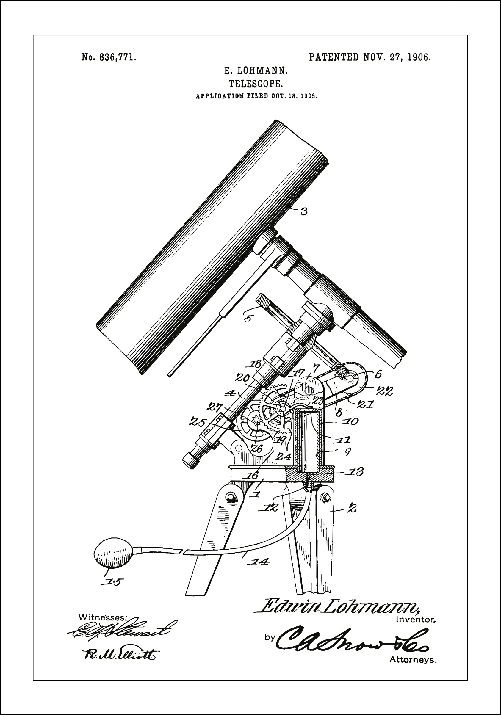 Ta patentni poster prikazuje mojstrsko zasnovo teleskopa, izum E. Lohmanna, patentiranega 27. novembra 1906 pod številko 836,771. Podrobnosti na risbi poudarjajo tehnične komponente in mehansko kompleksnost tega optičnega instrumenta. Črno-bela ilustracija na črnem ozadju ponuja močan vizualni kontrast, ki poudarja tehnično eleganco Lohmannove zasnove in jo naredi za cenjeno notranjo dekoracijo za vse, ki jih zanimata znanost in astronomija.