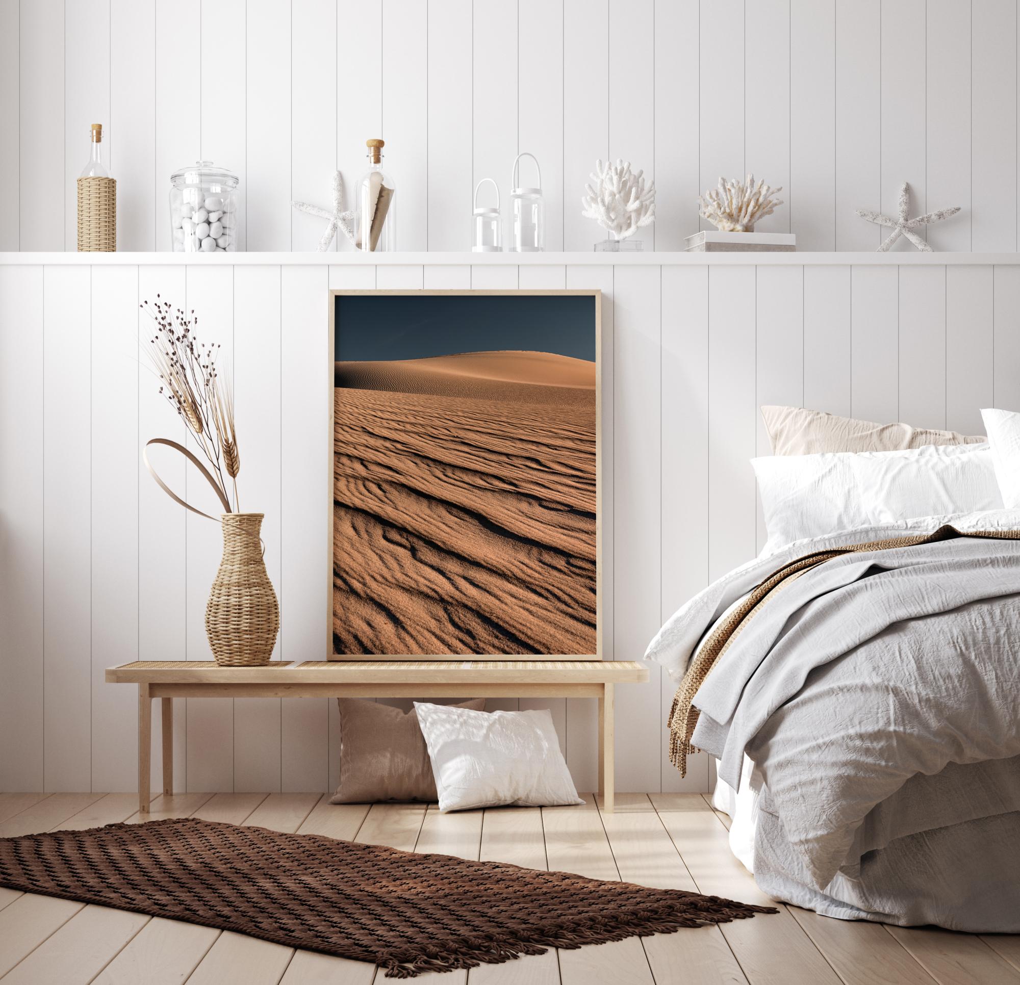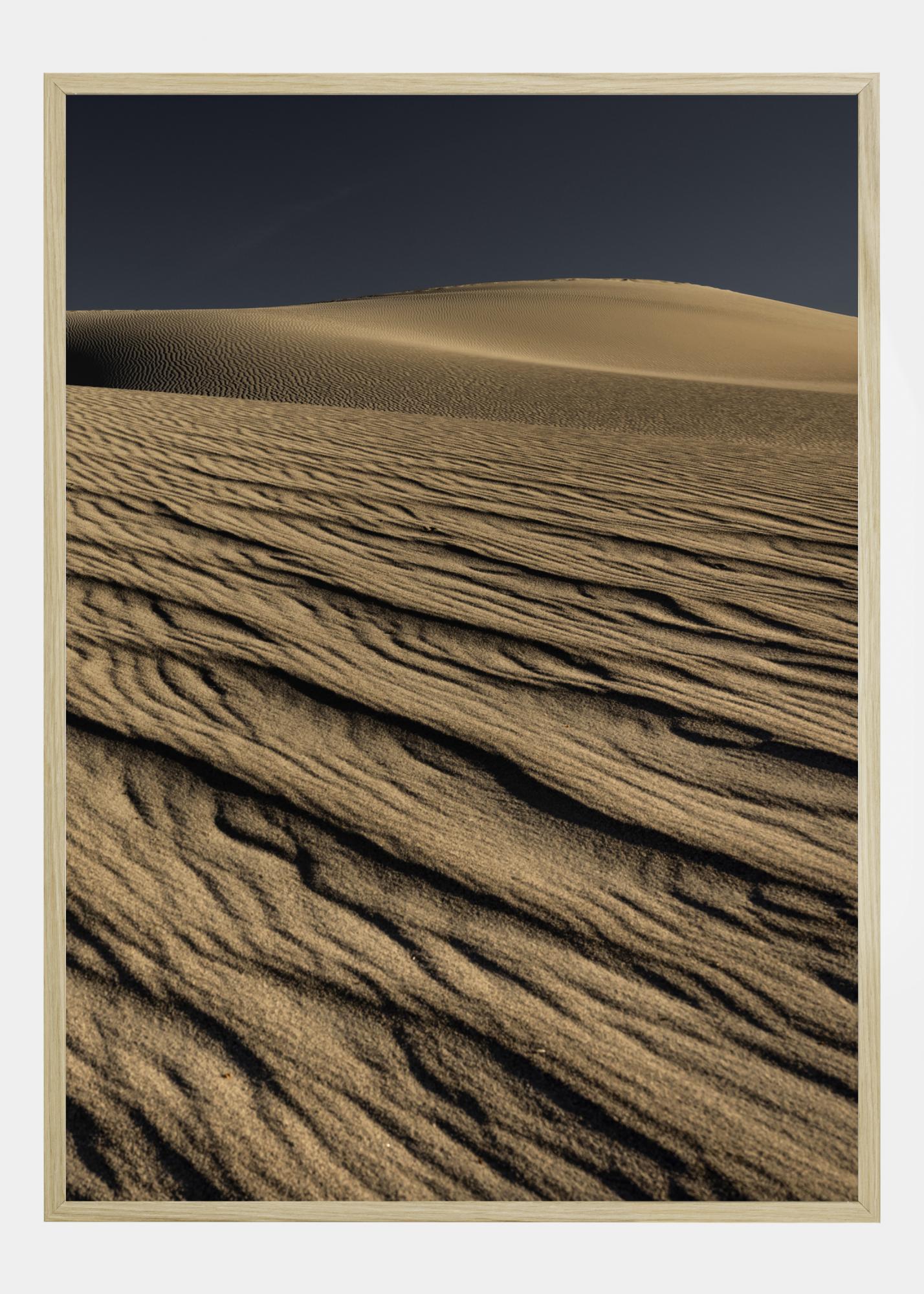 Dramatičen plakat z valovi peska na sipinah. Ta čudovita fotografija ustvarja harmonijo z kontrastnim rumenim peskom in modrim nebom. Kupite nekaj dramatike in pustite, da vaš pogled potuje skozi to sliko.